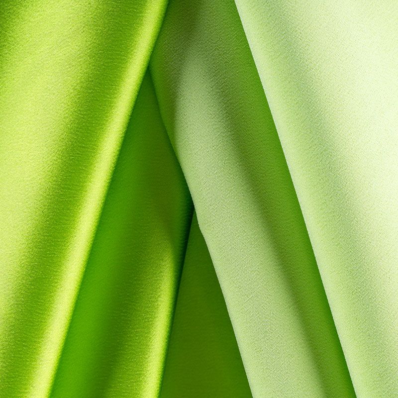 Итальянский костюмно-плательный атлас ватуссо яркого светлого оттенка лайма. Ткань плотная, но пластичная, хорошо держит форму и отлично тянется, собирается в красивые складки и драпировки. Почти не мнется, очень удобный и практичный. Блеск умеренный, смотрится дорого, благородно. Подойдет для пошива прямых силуэтов-футляров, приталенных платьев с пышной юбкой и крупными драпировками, изделий с заложенными складками, нарядных изделий, вечерних костюмов, летнего пальто, юбки, для изготовления корсетов.