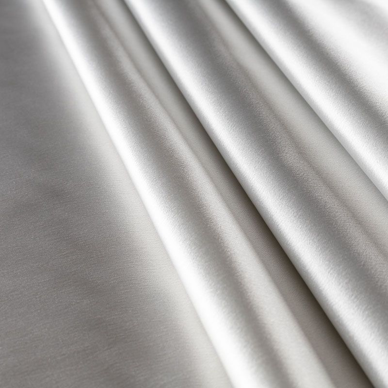 Итальянский костюмно-плательный атлас ватуссо светло-серого цвета с жемчужным оттенком. Ткань плотная, но пластичная, хорошо держит форму и отлично тянется, собирается в красивые складки и драпировки. Почти не мнется, очень удобный и практичный. Блеск умеренный, смотрится дорого, благородно. Подойдет для пошива прямых силуэтов-футляров, приталенных платьев с пышной юбкой и крупными драпировками, изделий с заложенными складками, нарядных изделий, вечерних костюмов, летнего пальто, юбки, для изготовления корсетов.