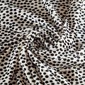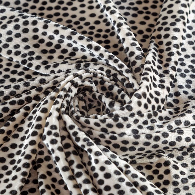 Пластичная, мягкая бархатная ткань с мелким принтом в черный горох. Ткань очень приятна на ощупь, не мнется, хорошо тянется за счет эластана в составе и драпируется. Бархат идеально подходит для пошива вечерних платьев, юбок, костюмов, а также стильных жакетов, бомберов и аксессуаров.