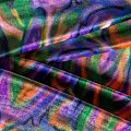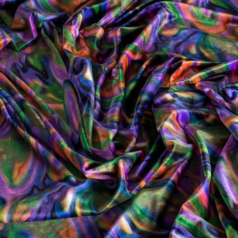 Пластичный, мягкий бархат с абстрактным дизайном в фиолетово-зеленых оттенках. Ткань очень приятна на ощупь, не мнется, хорошо тянется за счет эластана в составе и драпируется. Цвет играет отблесками и полутонами. Бархат идеально подходит для пошива вечерних платьев, юбок, костюмов, а также стильных аксессуаров.