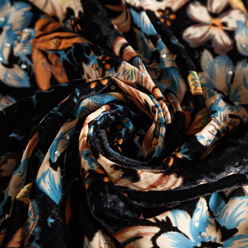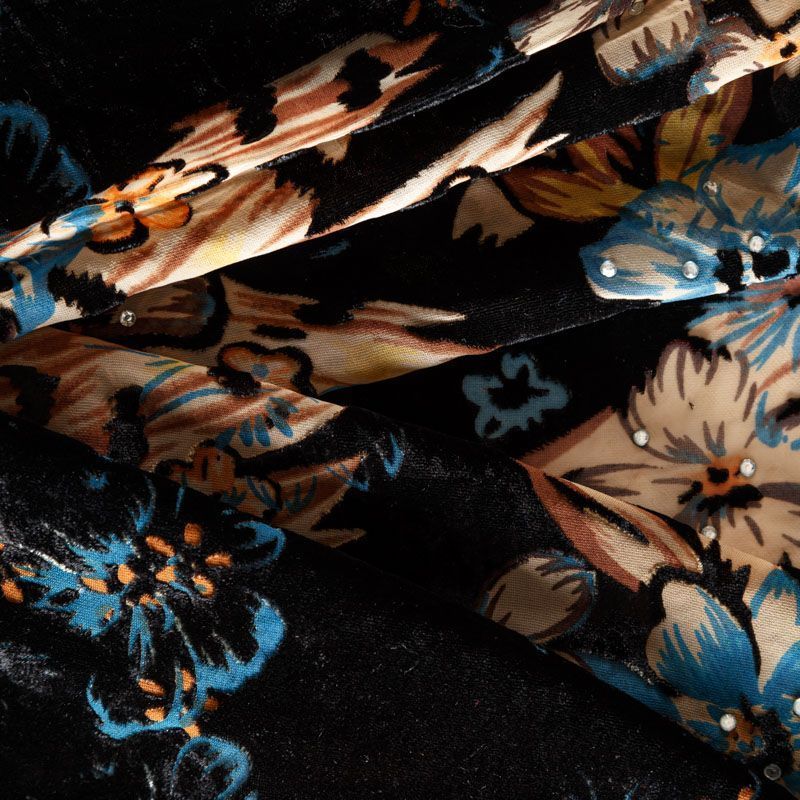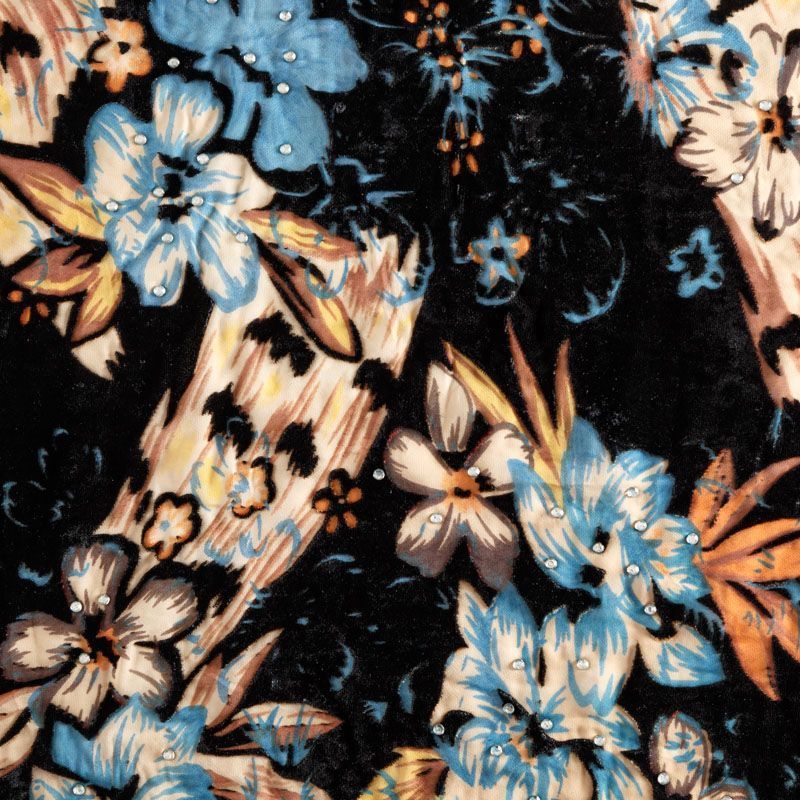 Итальянский бархат с цветочным принтом и стразами. Ткань легкая, пластичная, мягкая, с коротким и блестящим ворсом, имеющим направление, очень приятная на ощупь, прекрасно драпируется. Подойдет для платья, юбки, туники, блузки, комбинезона, свободных брюк и костюма свободного кроя.