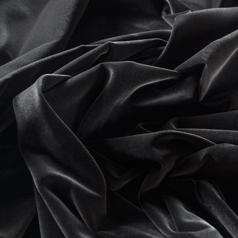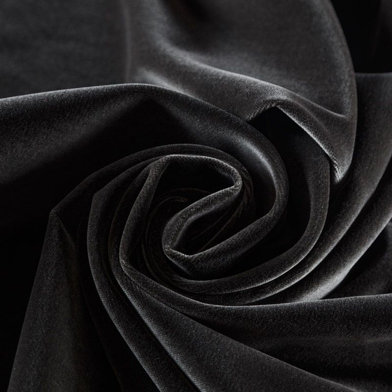 Хлопковый итальянский бархат глубокого серого оттенка. Ткань плотная, мягкая с коротким ворсом. Не грубая, хорошо драпируется. Имеет благородный матовый оттенок. Подойдет для пошива нарядного костюма, жакета, юбки, жилета, шорт, комбинезонов, брюк, платья-футляр, легкого пальто или бомбера.