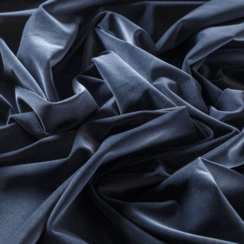 Хлопковый итальянский бархат серо-синего оттенка. Ткань плотная, мягкая с коротким ворсом. Не грубая, хорошо драпируется. Имеет благородный матовый оттенок. Подойдет для пошива нарядного костюма, жакета, юбки, жилета, шорт, комбинезонов, брюк, платья-футляр, легкого пальто или бомбера.