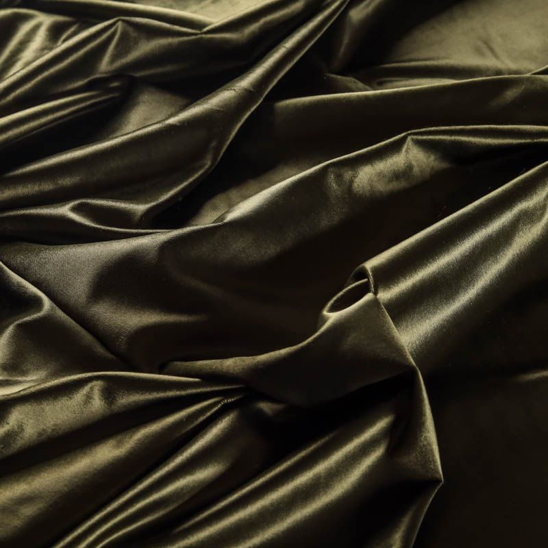 Плотный хлопковый итальянский бархат оттенка хаки со сдержанным глянцем на поверхности. Ткань очень приятная на ощупь, гладкая шлифованная поверхность, хорошо держит форму. Идеальный вариант для нарядного костюма, жакета, легкого пальто, юбки, жилета, брюк, платья-футляра.