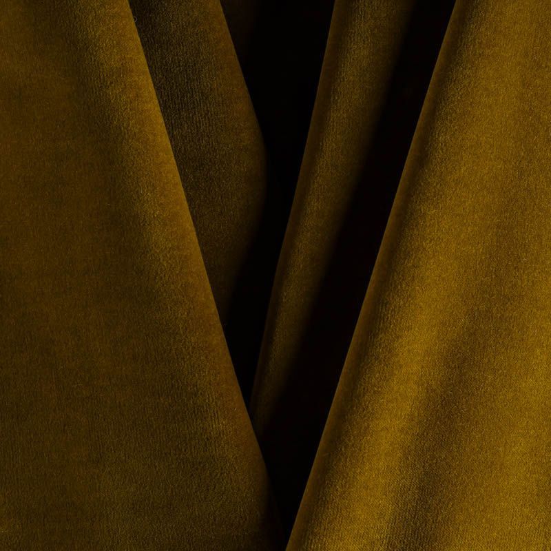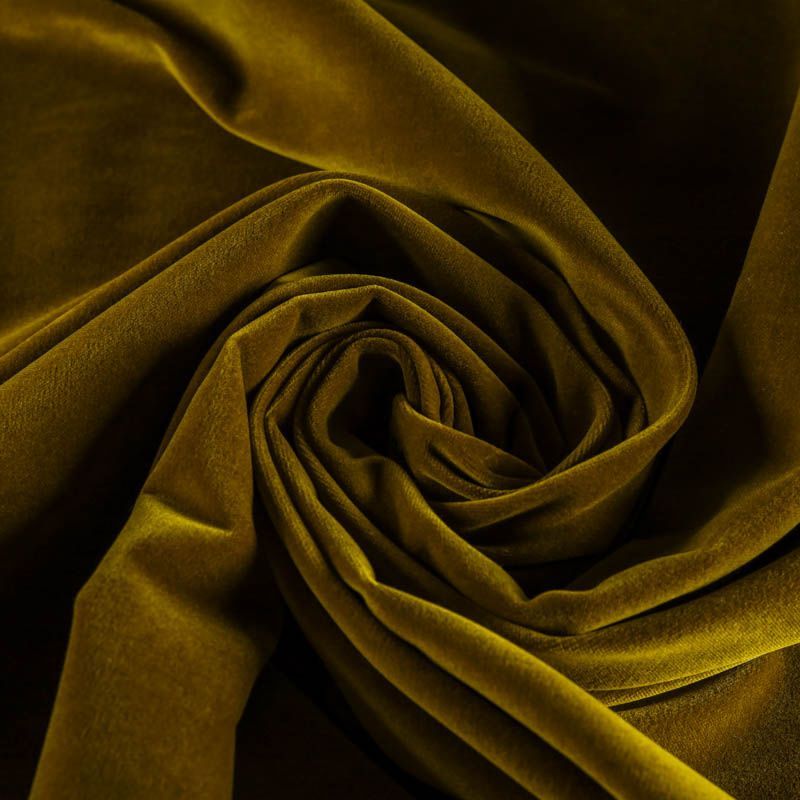 Плотный итальянский бархат из хлопка цвета темной горчицы с добавлением эластана. Ткань очень приятная на ощупь, пластичная, поверхность матовая, держит форму, прочная, износостойкая.  Идеально подойдет для костюма, жакета, юбки, жилета, комбинезона, брюк, платья-футляра.
