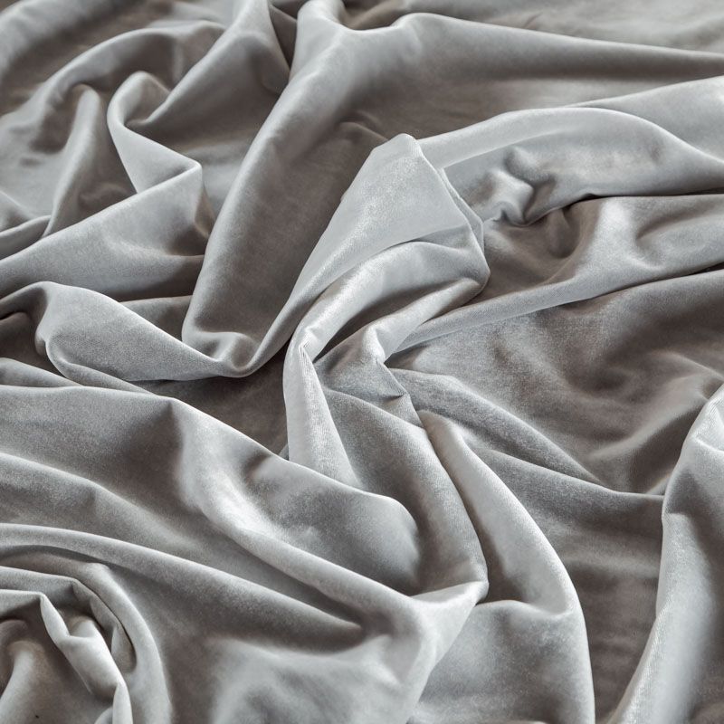 Итальянский бархат жемчужно-сером оттенке от бренда Ungaro. Ткань легкая, пластичная, мягкая, с коротким и блестящим ворсом, имеющим направление, очень приятная на ощупь, прекрасно драпируется. Подойдет для платья, юбки, туники, блузки, комбинезона, свободных брюк и костюма свободного кроя.