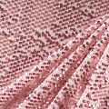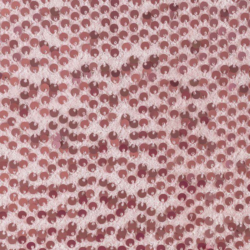 Бархатное полотно на трикотажной основе нежного пудрово-розового оттенка. По всей поверхности ткань усеяна матовыми пайетками, которые очень деликатно отражают свет. Бархат достаточно тонкий и пластичный, прекрасно драпируется и укладывается в складки. Пайетки на бархате эффектно смотрятся в виде широких оборок и воланов, юбок прямого силуэта, свободных платьев-балахонов, курток, бомберов и топов с напусками.
