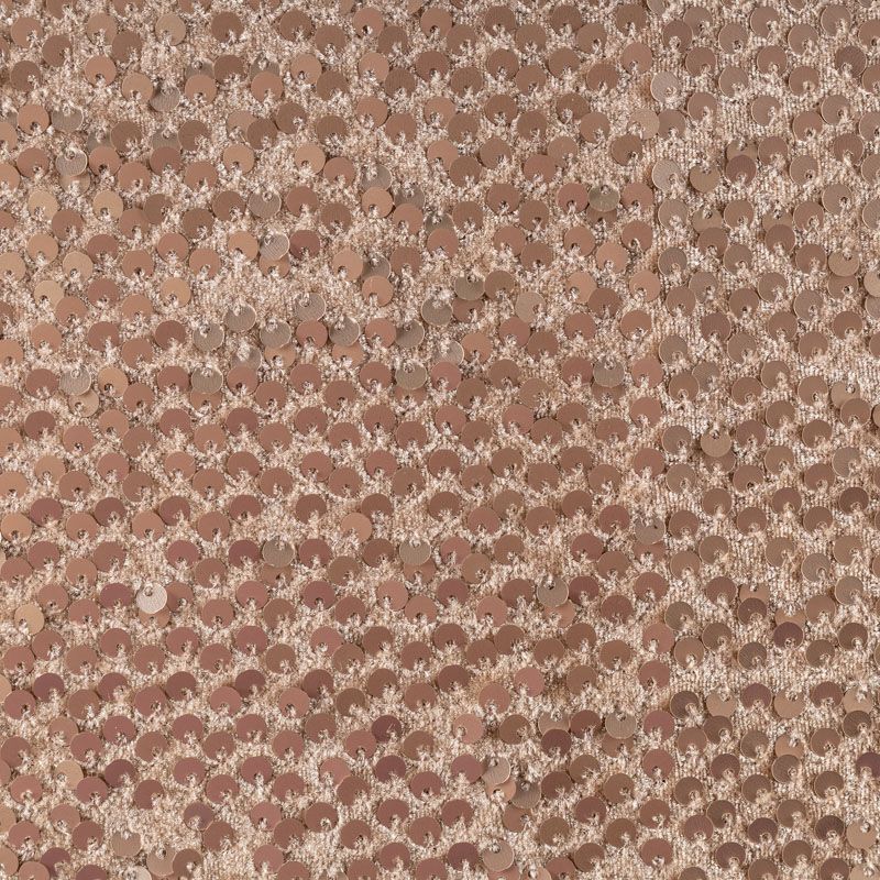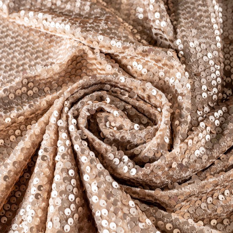 Бархатное полотно на трикотажной основе теплого золотисто-бежевого оттенка. По всей поверхности ткань усеяна матовыми пайетками, которые очень деликатно отражают свет. Бархат достаточно тонкий и пластичный, прекрасно драпируется и укладывается в складки. Пайетки на бархате эффектно смотрятся в виде широких оборок и воланов, юбок прямого силуэта, свободных платьев-балахонов, курток, бомберов и топов с напусками.