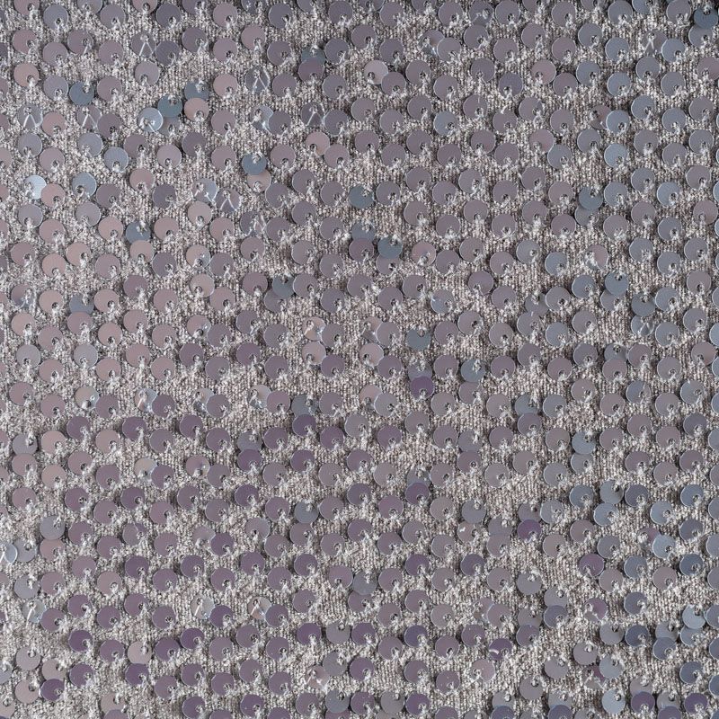 Бархатное полотно на трикотажной основе благородного серебристо-серого оттенка. По всей поверхности ткань усеяна матовыми пайетками, которые очень деликатно отражают свет. Бархат достаточно тонкий и пластичный, прекрасно драпируется и укладывается в складки. Пайетки на бархате эффектно смотрятся в виде широких оборок и воланов, юбок прямого силуэта, свободных платьев-балахонов, курток, бомберов и топов с напусками.