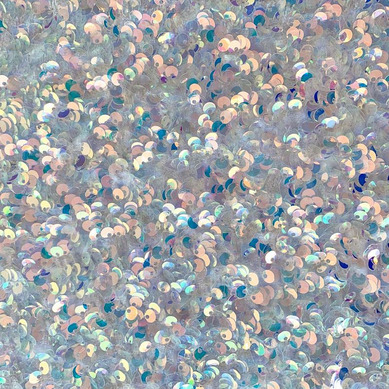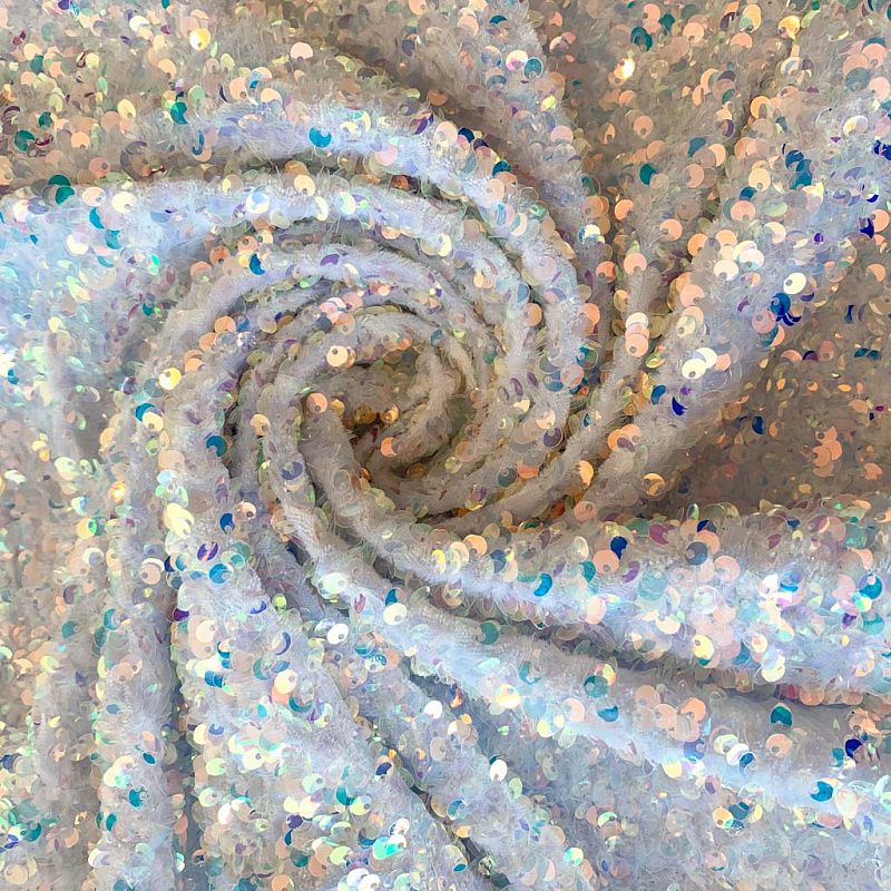 Бархатное полотно белого цвета по всей поверхности усеяно объемными глянцевыми "бензиновыми" пайетками. Ткань пластичная, прекрасно драпируется и укладывается в складки. Легко садится на фигуру за счёт основы с эластаном. Пайетки на бархате эффектно смотрятся в виде широких оборок и воланов, юбок прямого силуэта, свободных платьев-балахонов, курток, бомберов и топов с напусками.