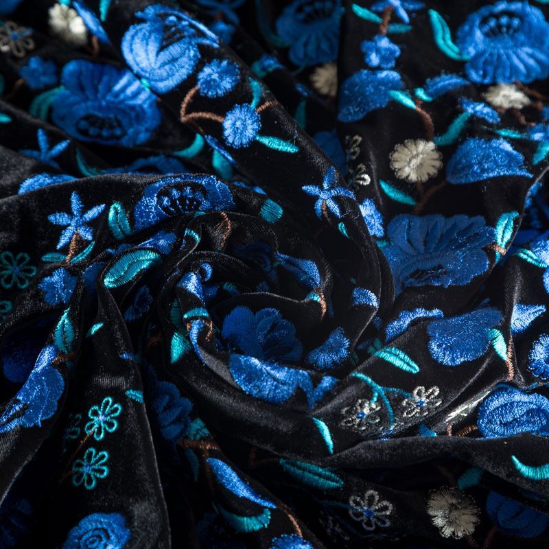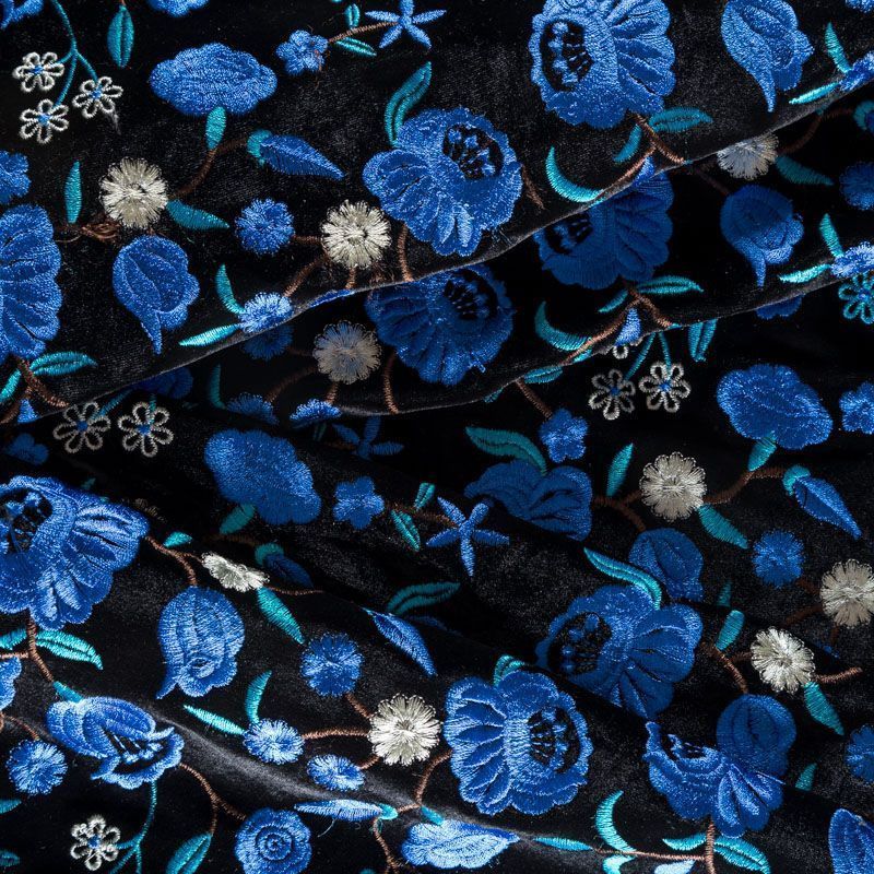 Итальянский бархат черного цвета, декорирован вышивкой фантазийными цветами в голубых оттенках, расположенной по всему полотну. Ткань приятная на ощупь, хорошо драпируется и держит форму, обладает благородным блеском, тянется за счет эластана в составе. Прекрасно подойдет для жакета, юбки, костюма, жилета, платья.