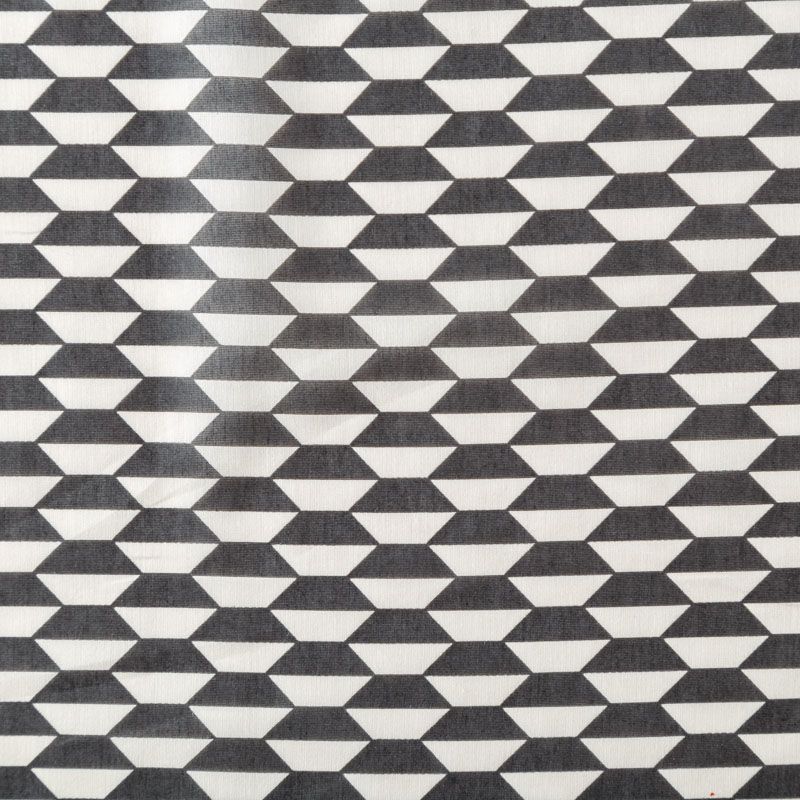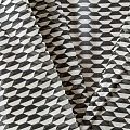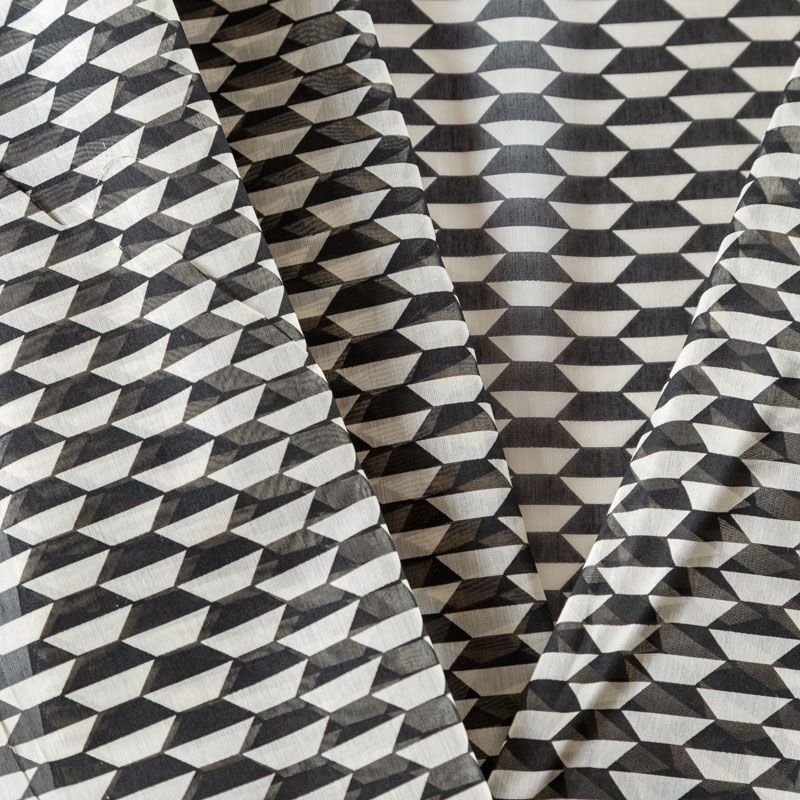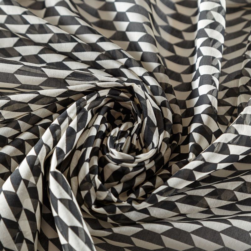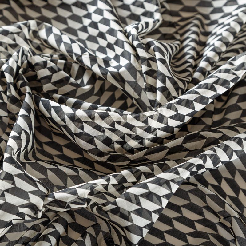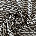 Хлопковый батист с добавлением шелка с молочно-черным геометрическим принтом. Ткань очень легкая, прозрачная, приятная на ощупь, нежная, пластичная, хорошо и мягко драпируется, летящая. Батист подойдёт для модных блуз с объёмными рукавами, летних платьев и сарафанов с длинной летящей юбкой, прозрачных рубашек, декорированных объёмными бантами, туник и топов.