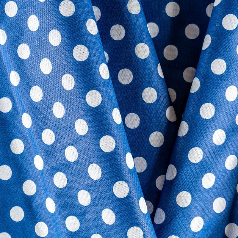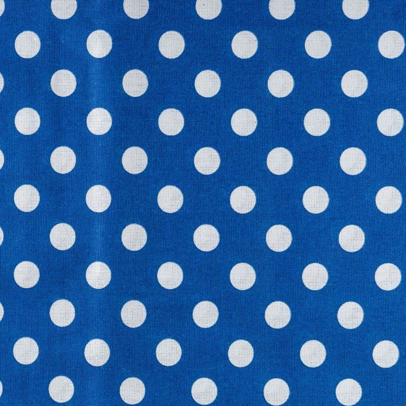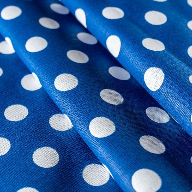 Плотная натуральная ткань с особым принципом переплетения нитей: крест-накрест. Имеет гладкую матовую поверхность чуть шероховатую на ощупь, не тянется, немного просвечивает. Прочная и стойкая к износу, надолго сохраняет яркость красок, не растягивается при стирке, практически не мнется. Принт в белый горошек среднего размера (1,5 см) на темно-синем фоне прекрасно подойдет для пошива постельного белья, изготовления пеленок, бортиков для кроватки, домашней одежды и других предметов интерьера.