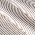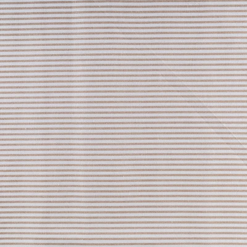 Плотная натуральная ткань с особым принципом переплетения нитей: крест-накрест. Имеет гладкую матовую поверхность чуть шероховатую на ощупь, не тянется, немного просвечивает. Прочная и стойкая к износу, надолго сохраняет яркость красок, не растягивается при стирке, практически не мнется. Рисунок в узкую бежевую полоску на белом фоне прекрасно подойдет для пошива постельного белья, изготовления пеленок, бортиков для кроватки, домашней одежды и других предметов интерьера.