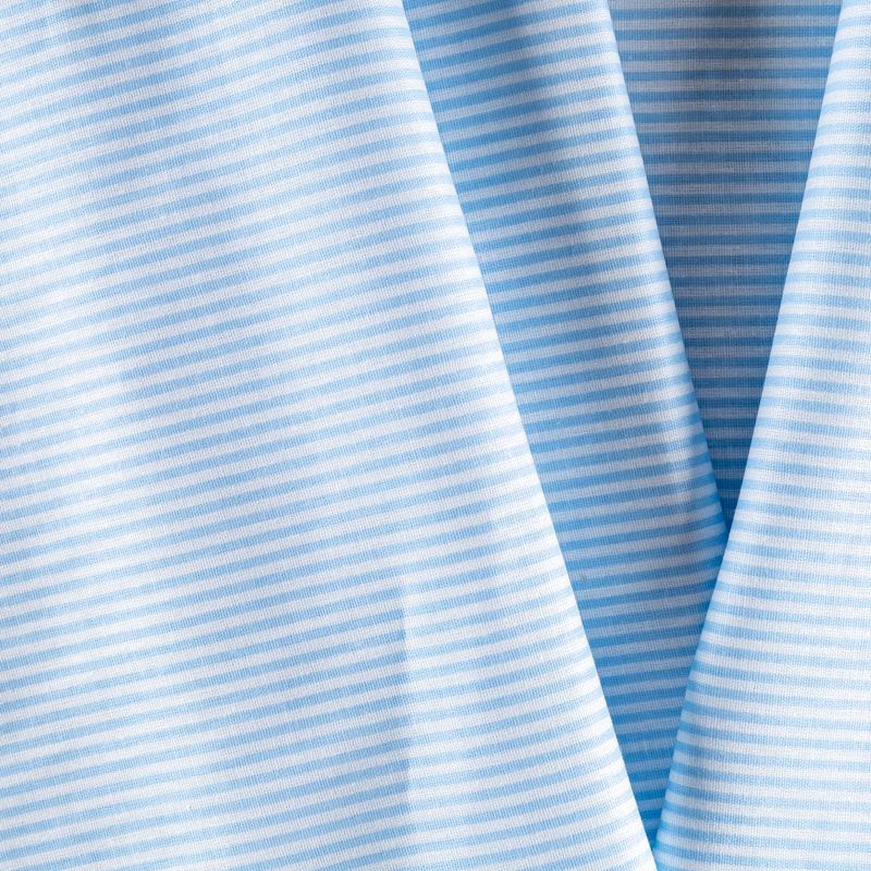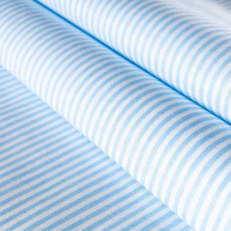 Плотная натуральная ткань с особым принципом переплетения нитей: крест-накрест. Имеет гладкую матовую поверхность чуть шероховатую на ощупь, не тянется, немного просвечивает. Прочная и стойкая к износу, надолго сохраняет яркость красок, не растягивается при стирке, практически не мнется. Рисунок в узкую голубую полоску на белом фоне прекрасно подойдет для пошива постельного белья, изготовления пеленок, бортиков для кроватки, домашней одежды и других предметов интерьера.