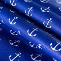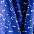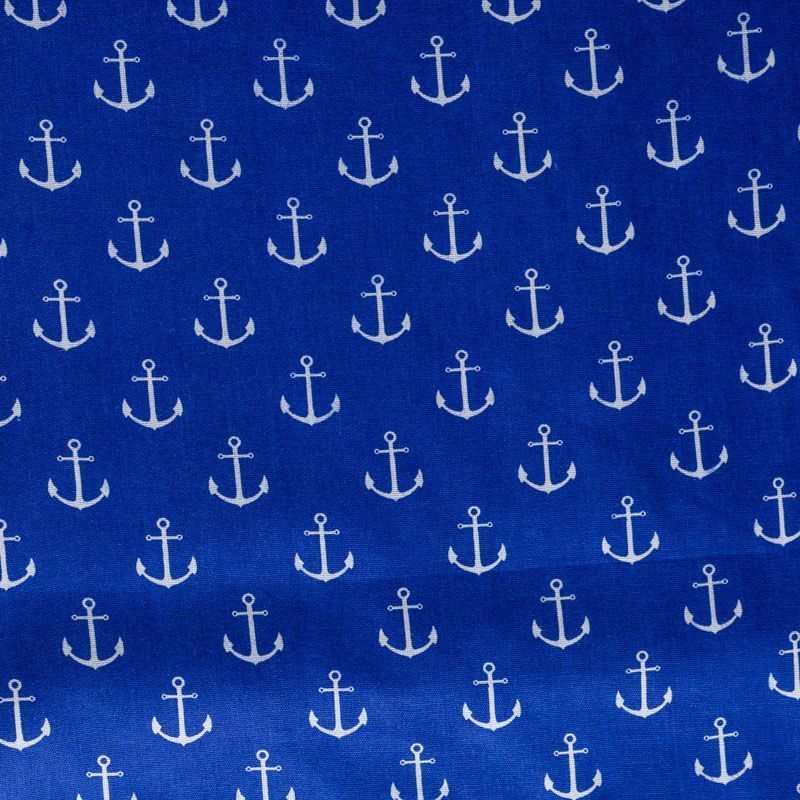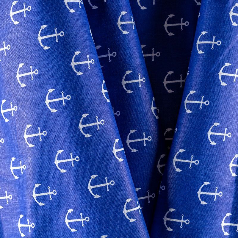 Плотная натуральная ткань с особым принципом переплетения нитей: крест-накрест. Имеет гладкую матовую поверхность, немного шероховатая на ощупь, не тянется, немного просвечивает. Прочная и стойкая к износу, надолго сохраняет яркость красок, практически не мнется. Морской летний принт в виде белых якорей на насыщенном фиолетово-синем фоне прекрасно подойдет для пошива постельного белья, изготовления пеленок, бортиков для кроватки, домашней одежды и других предметов интерьера.
