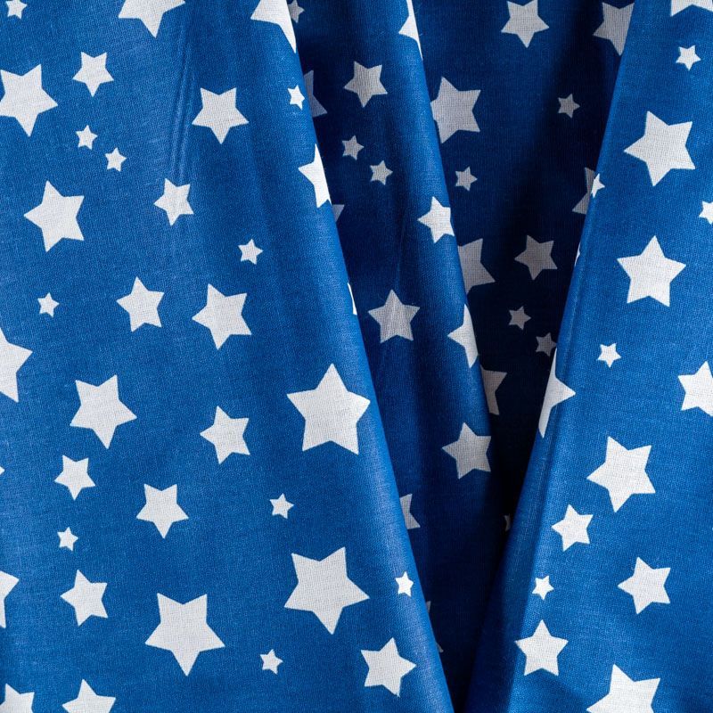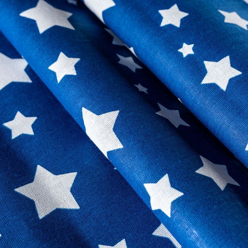 Плотная натуральная ткань с особым принципом переплетения нитей: крест-накрест. Имеет гладкую матовую поверхность чуть шероховатую на ощупь, не тянется, немного просвечивает. Прочная и стойкая к износу, надолго сохраняет яркость красок, не растягивается при стирке, практически не мнется. Принт в виде белых звездочек разного размера на глубоком синем фоне прекрасно подойдет для пошива постельного белья, изготовления пеленок, бортиков для кроватки, домашней одежды и других предметов интерьера.