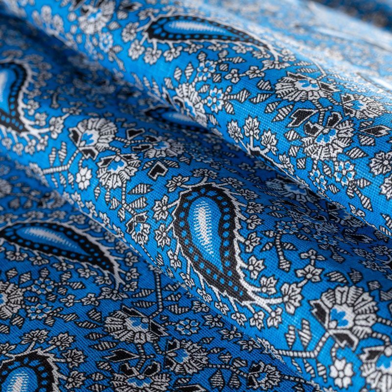 Плотная натуральная ткань с особым принципом переплетения нитей: крест-накрест. Имеет гладкую матовую поверхность, немного шероховатая на ощупь, не тянется, немного просвечивает. Прочная и стойкая к износу, надолго сохраняет яркость красок, практически не мнется. Восточный принт пейсли на насыщенном васильковом фоне прекрасно подойдет для пошива постельного и столового белья, изготовления домашней одежды и других предметов интерьера.