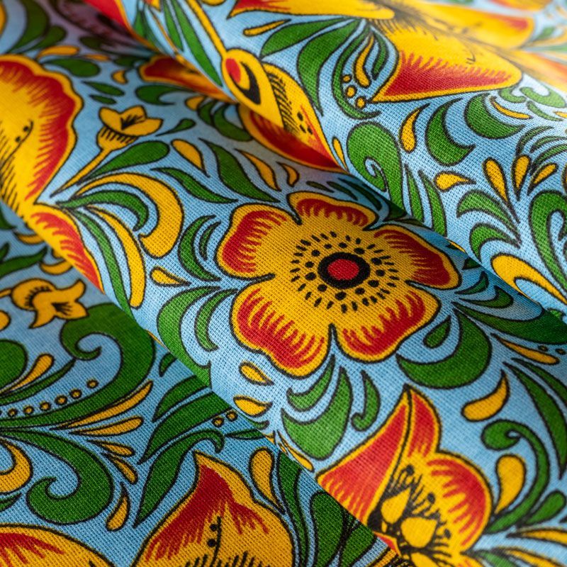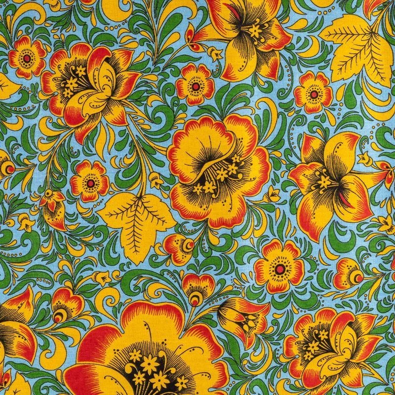 Плотная натуральная ткань с особым принципом переплетения нитей: крест-накрест. Имеет гладкую матовую поверхность, немного шероховатая на ощупь, не тянется, немного просвечивает. Прочная и стойкая к износу, надолго сохраняет яркость красок, практически не мнется. Яркий узнаваемый принт по мотивам народного творчества на голубом фоне прекрасно подойдет для пошива постельного и столового белья, изготовления сценических костюмов, домашней одежды и других предметов интерьера.