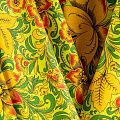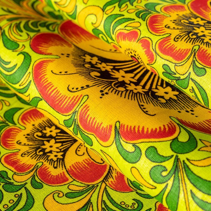 Плотная натуральная ткань с особым принципом переплетения нитей: крест-накрест. Имеет гладкую матовую поверхность, немного шероховатая на ощупь, не тянется, немного просвечивает. Прочная и стойкая к износу, надолго сохраняет яркость красок, практически не мнется. Яркий узнаваемый принт по мотивам народного творчества на салатово-зеленом фоне прекрасно подойдет для пошива постельного и столового белья, изготовления сценических костюмов, домашней одежды и других предметов интерьера.
