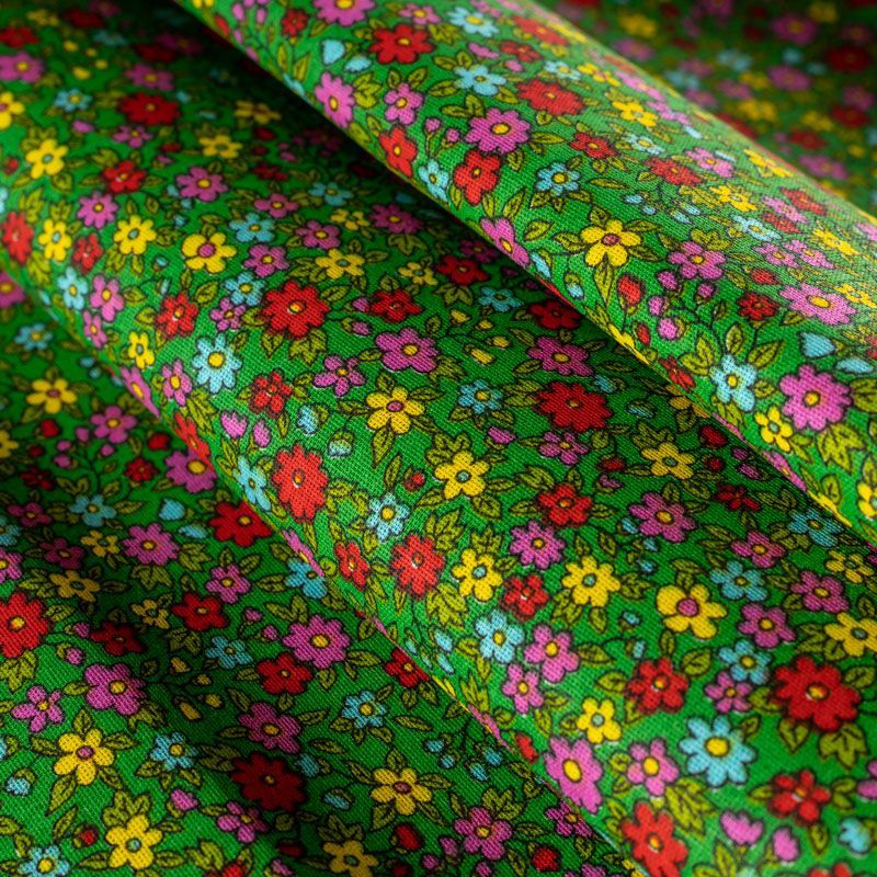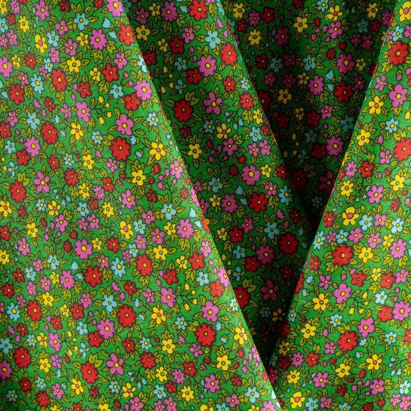 Плотная натуральная ткань с особым принципом переплетения нитей: крест-накрест. Имеет гладкую матовую поверхность, немного шероховатая на ощупь, не тянется, немного просвечивает. Прочная и стойкая к износу, надолго сохраняет яркость красок, практически не мнется. Мелкий цветочный принт на зеленом фоне прекрасно подойдет для пошива домашней одежды, халатов, фартуков, сарафанов и других предметов интерьера.