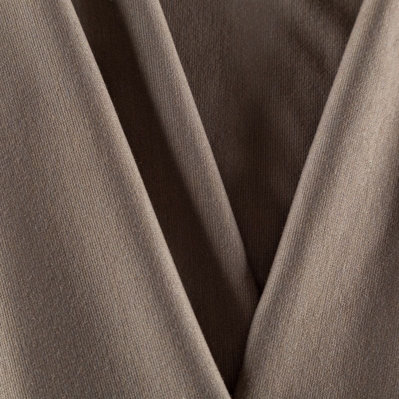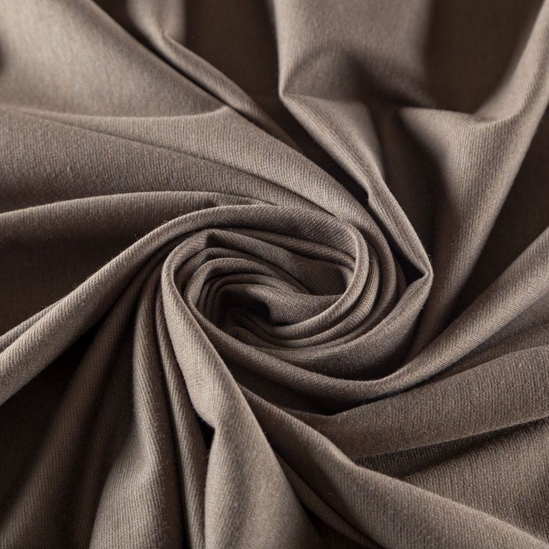 Плотное трикотажное полотно коричневого оттенка с холодным подтоном. Обе стороны ткани ровные, гладкие. Материал эластичный, имеет растяжимость по всем сторонам, хорошо держит форму, уютный, приятный к телу и удобный в носке. Применяется в пошиве платьев, юбок, костюмов, жакетов.