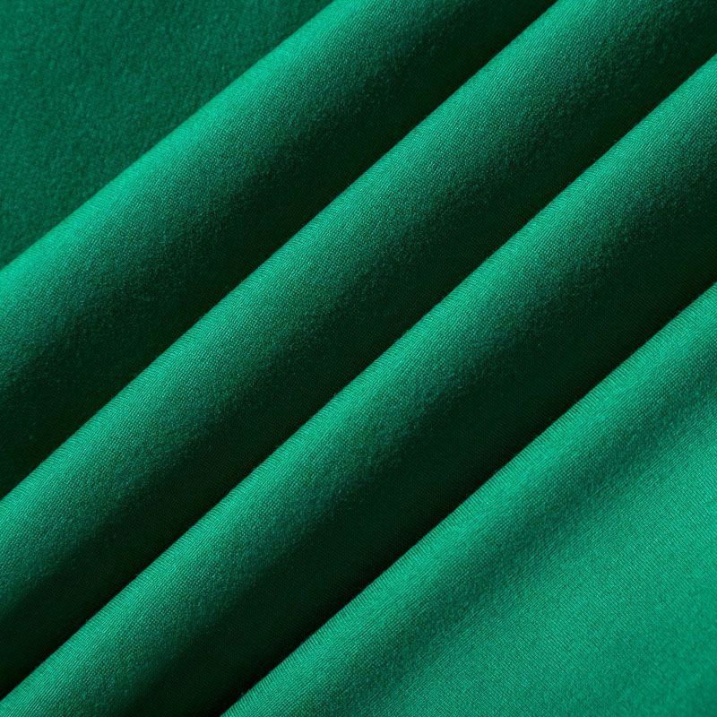 Эластичный, плотный хлопковый трикотаж изумрудного оттенка с теплым подтоном. Поверхность ткани гладкая и матовая, с изнанки - с шелковистым мягким ворсом.  Материал упругий, имеет растяжимость по всем сторонам, не просвечивается, хорошо держит форму, уютный, приятный к телу и удобный в носке. Применяется в пошиве костюмов, жакетов, кардиганов, платьев и юбок.