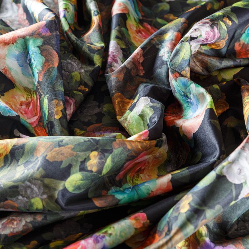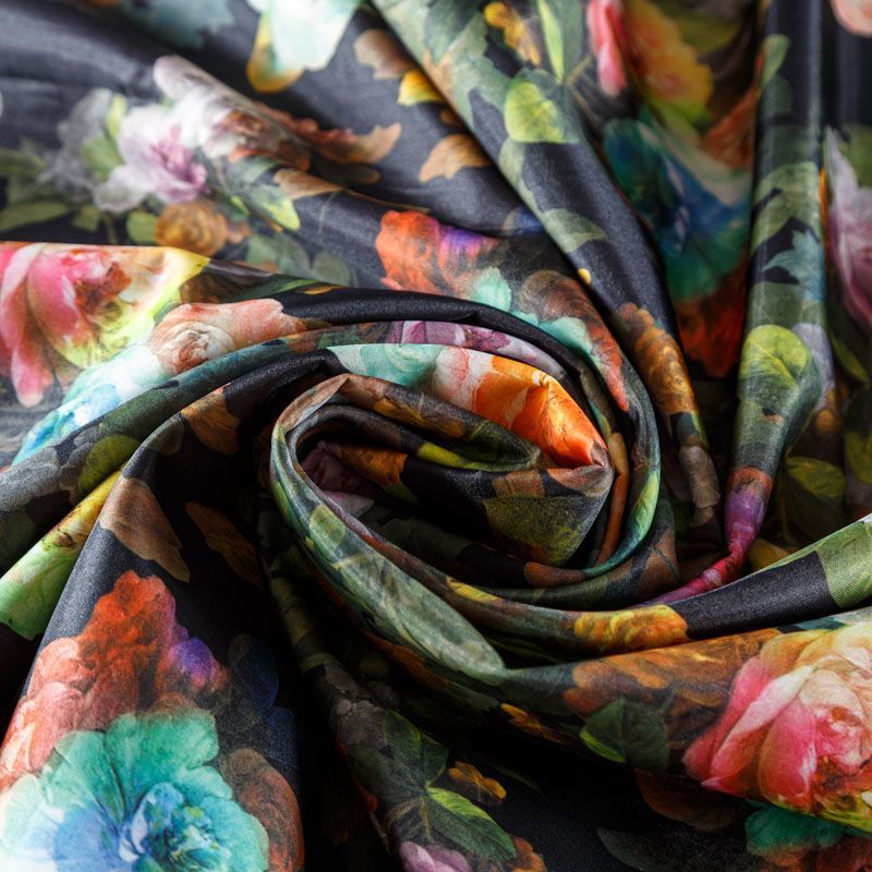 Трикотажное полотно средней плотности с цветочным принтом и слоем органзы. Обе стороны ткани ровные, гладкие. Материал эластичный, имеет растяжимость по всем сторонам, хорошо держит форму, уютный, приятный к телу и удобный в носке. Применяется в пошиве платьев, юбок, костюмов, жакетов.