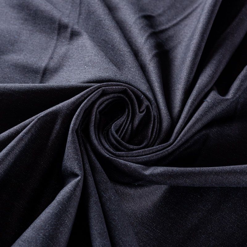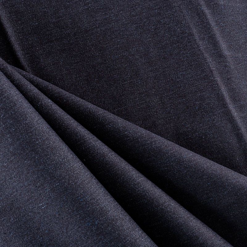 Джинсовое полотно черного оттенка. Поверхность ткани матовая, фактурная в диагональный рубчик. Материал имеет высокую плотность, при небольшой толщине, мягкий и приятный на ощупь, тянется за счет эластана в составе, обладает устойчивостью к истиранию и механическим повреждениям. Подойдет для пошива рубашек, сарафанов, платьев, юбок, шорт, брюк-джоггеров, лёгких курток и жакетов.
