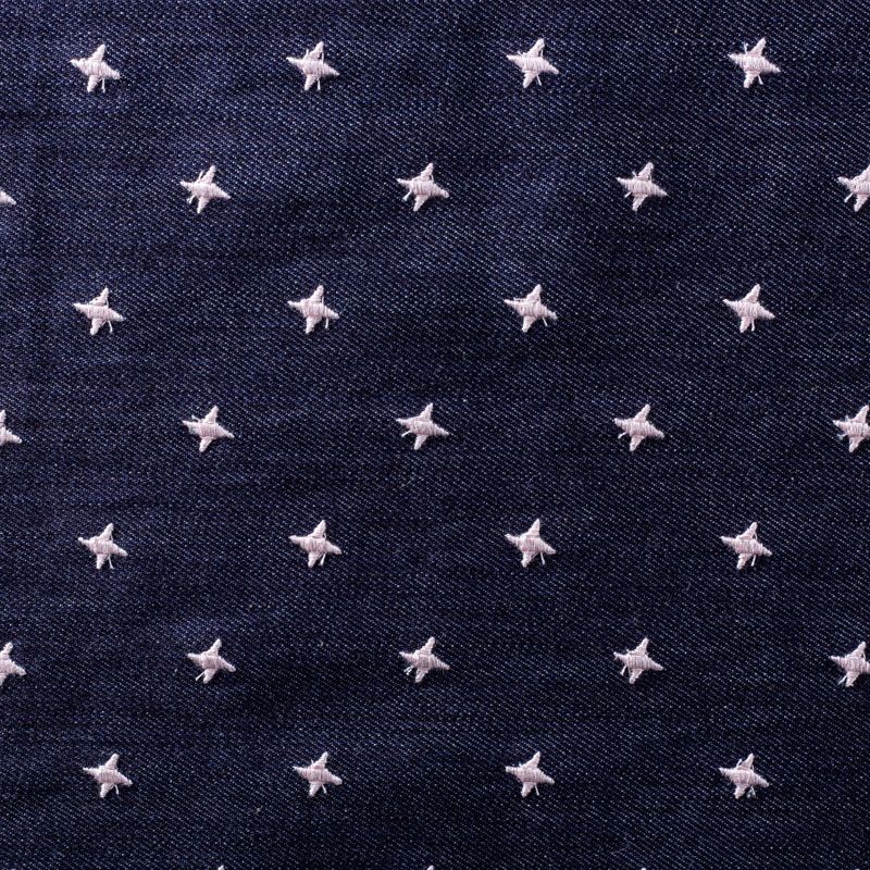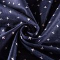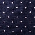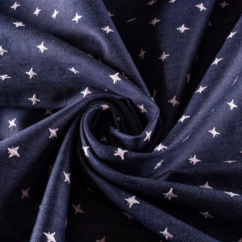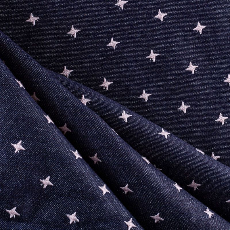 Плотная джинсовая ткань темно-синего оттенка с вышитыми мелкими звездочками молочного цвета. Ткань имеет диагональное плетение, не большую толщину, мягкая и приятная на ощупь, тянется за счет