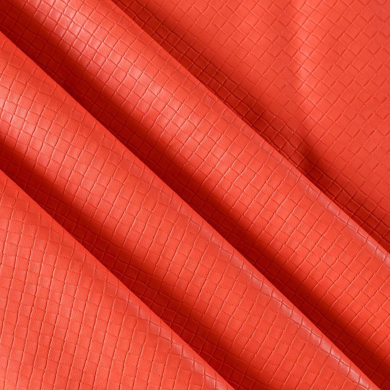 Экокожа в красном оттенке с объемной фактурой, имитирующей плетенку. Очень приятная на ощупь, пластичная. Подойдет для пошива платья, брюк, шорт, юбки, куртки, плаща, пальто-рубашки, а также сумки, рюкзака и других аксессуаров.