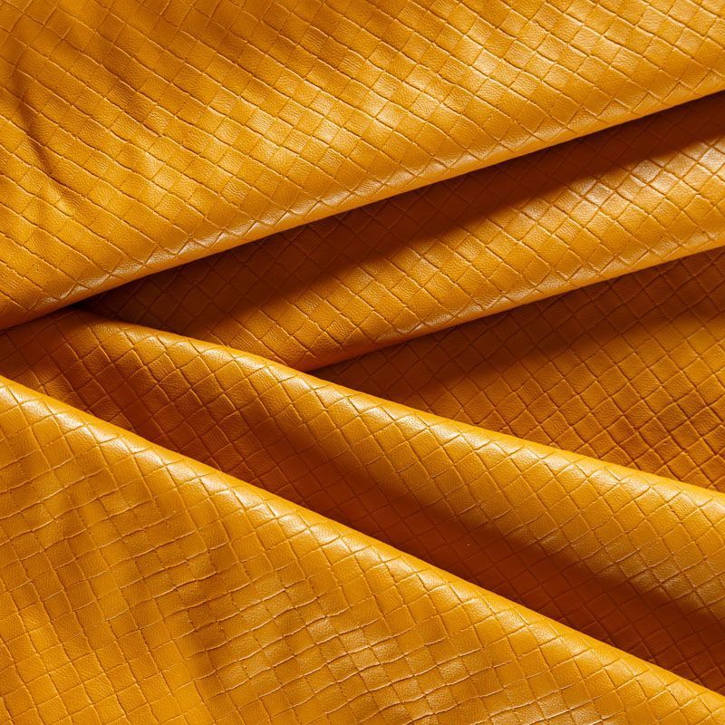 Экокожа в желтом оттенке с объемной фактурой, имитирующей плетенку. Очень приятная на ощупь, пластичная. Подойдет для пошива платья, брюк, шорт, юбки, куртки, плаща, пальто-рубашки, а также сумки, рюкзака и других аксессуаров.