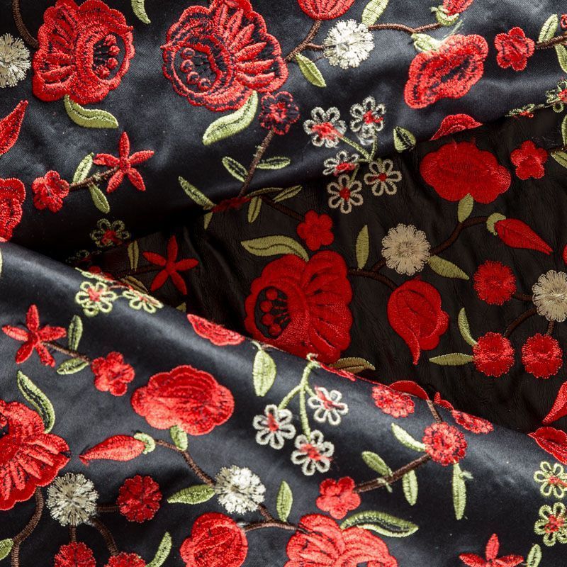 Искусственный материал, имитирующий натуральную кожу черного цвета с богатой объемной цветочной вышивкой в красных оттенках. Поверхность ткани полуматовая, гладкая. Приятная на ощупь, держит форму, не просвечивает, пластичная. Подойдет для пошива куртки, костюма, платья, юбки, брюк, шорт, комбинезона, сумки, рюкзака.