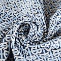 Итальянский брендовый футер с искусным лого-принтом на темно-синем фоне. Материал гладкий с лицевой стороны, с изнаночной стороны имеет нежную мелкую петельчатую текстуру. Ткань мягкая и комфортная, достаточно эластичная, пластичная. Хорошо садится по фигуре. Практически не мнется. После растягивания быстро возвращается к прежней форме. Подойдет для пошива толстовки, спортивного костюма, свитшота, платья в спортивном стиле.