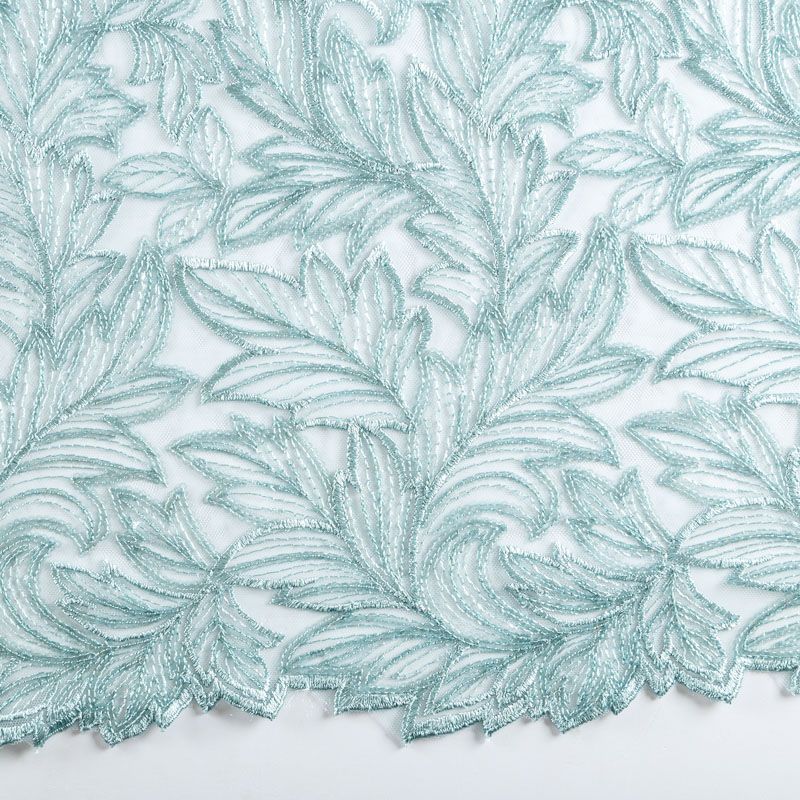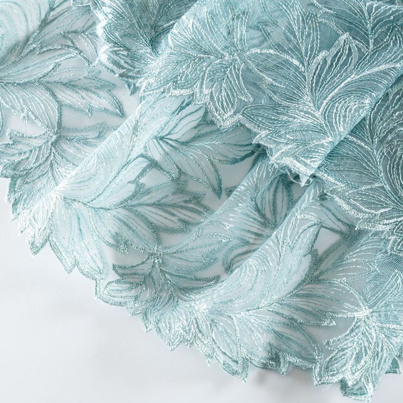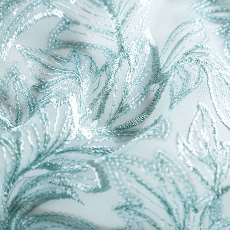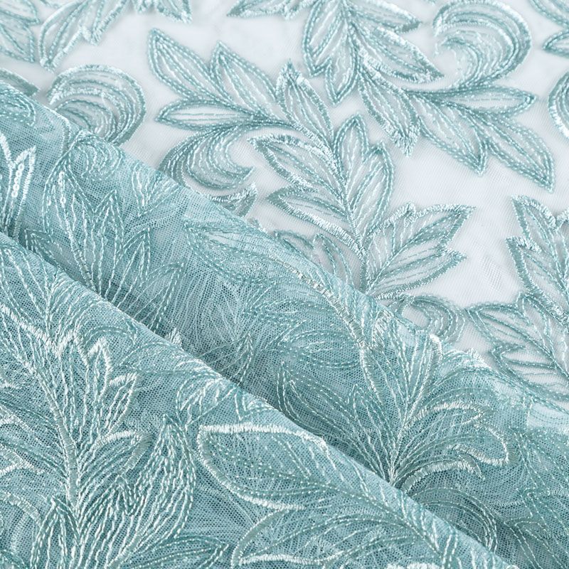Кружевное полотно на сетчатой основе холодного бирюзового оттенка с растительным узором, расположенным по ширине ткани. Тонкое, легкое, очень мягкое и пластичное, хорошо драпируется, приятное тактильно. Вышивка дополнена глянцевыми пайетками в тон. С обеих сторон ткань украшена симметричными фестонами, что придает полотну законченный и нарядный вид. Великолепно будет смотреться в нарядном вечернем, свадебном платье, платье на выпускной бал, в юбках, блузках, топах. На изделие набирается объемом.