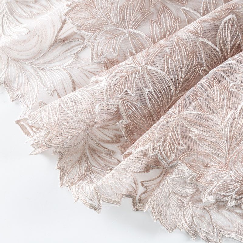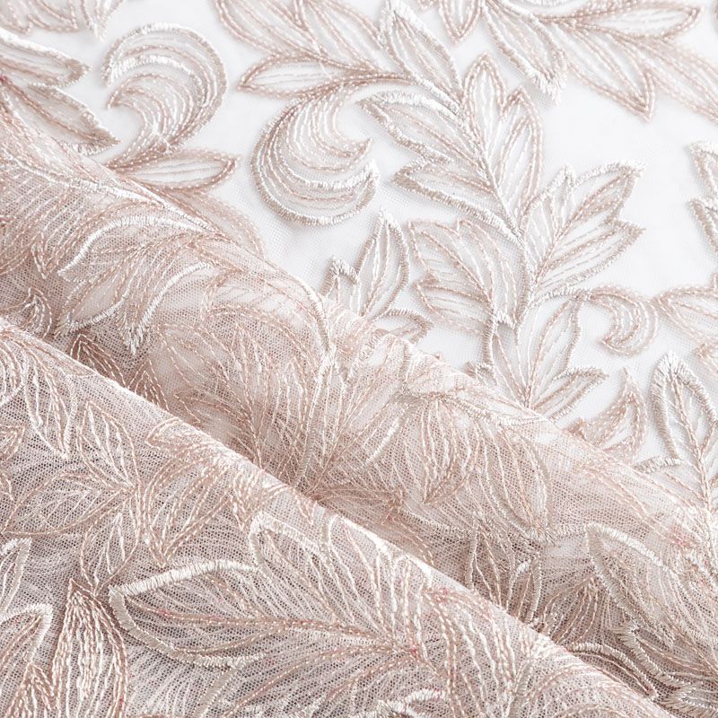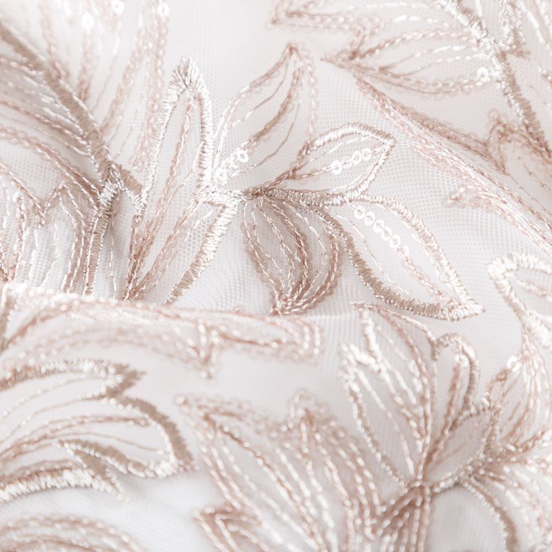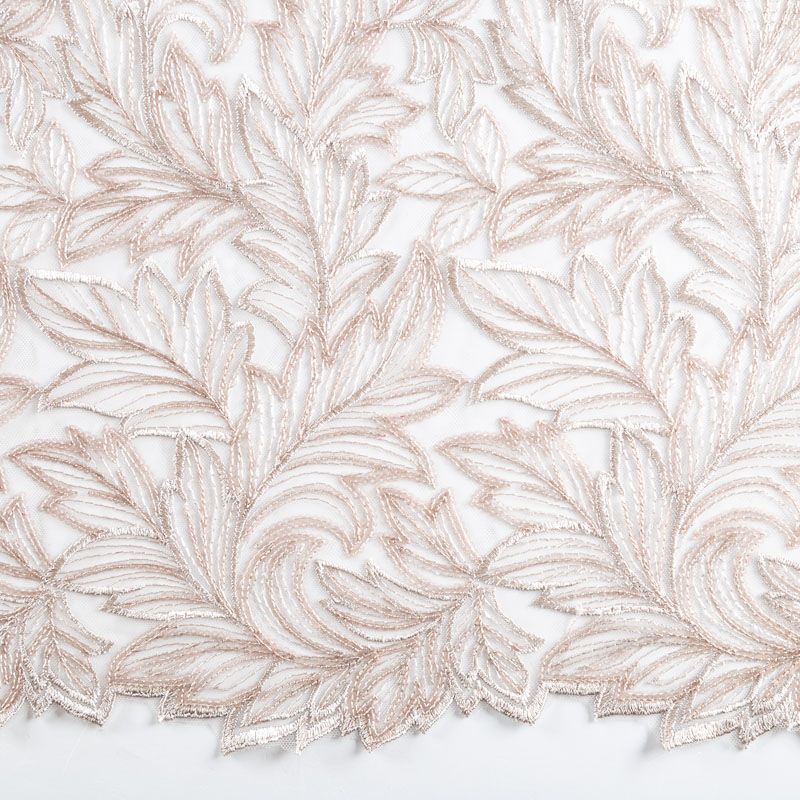 Кружевное полотно на сетчатой основе пудрового оттенка с растительным узором, расположенным по ширине ткани. Тонкое, легкое, очень мягкое и пластичное, хорошо драпируется, приятное тактильно. Вышивка дополнена глянцевыми пайетками в тон. С обеих сторон ткань украшена симметричными фестонами, что придает полотну законченный и нарядный вид. Великолепно будет смотреться в нарядном вечернем, свадебном платье, платье на выпускной бал, в юбках, блузках, топах. На изделие набирается объемом.