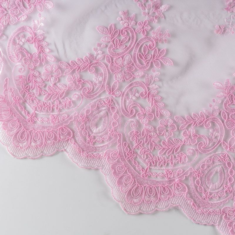 Вышивка на сетке розового оттенка с флористическим узором. Полотно мягкое, легкое и пластичное, хорошо тянется. Сетка не жесткая, приятная к телу. Узор вышит мягкой пряжей, образуя красивую фактуру, имитирующую ручную вышивку, и оформлен кордовой нитью. С обеих сторон ткань украшена симметричными фестонами, что придает полотну законченный и нарядный вид. Великолепно будет смотреться в нарядном вечернем, свадебном платье, платье на выпускной бал, в юбках, блузках, топах. Набирается для изделя объемом.
