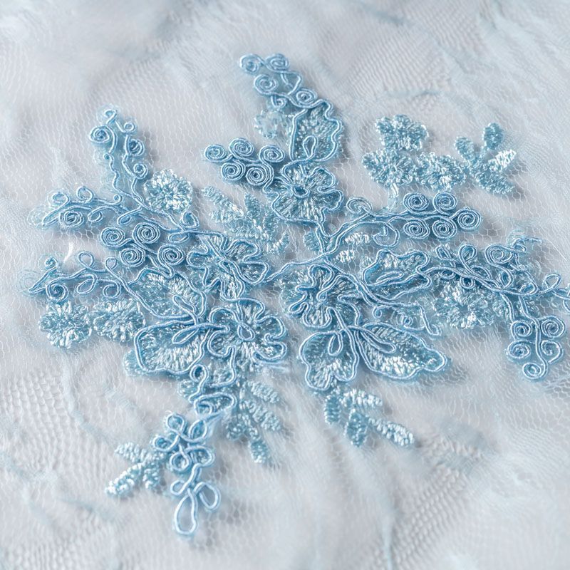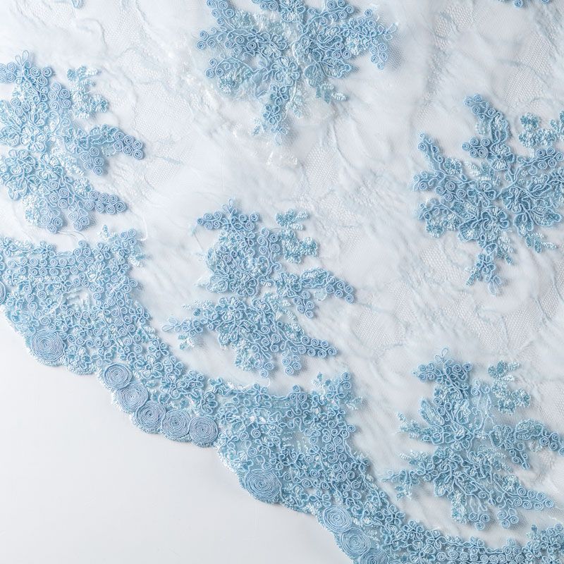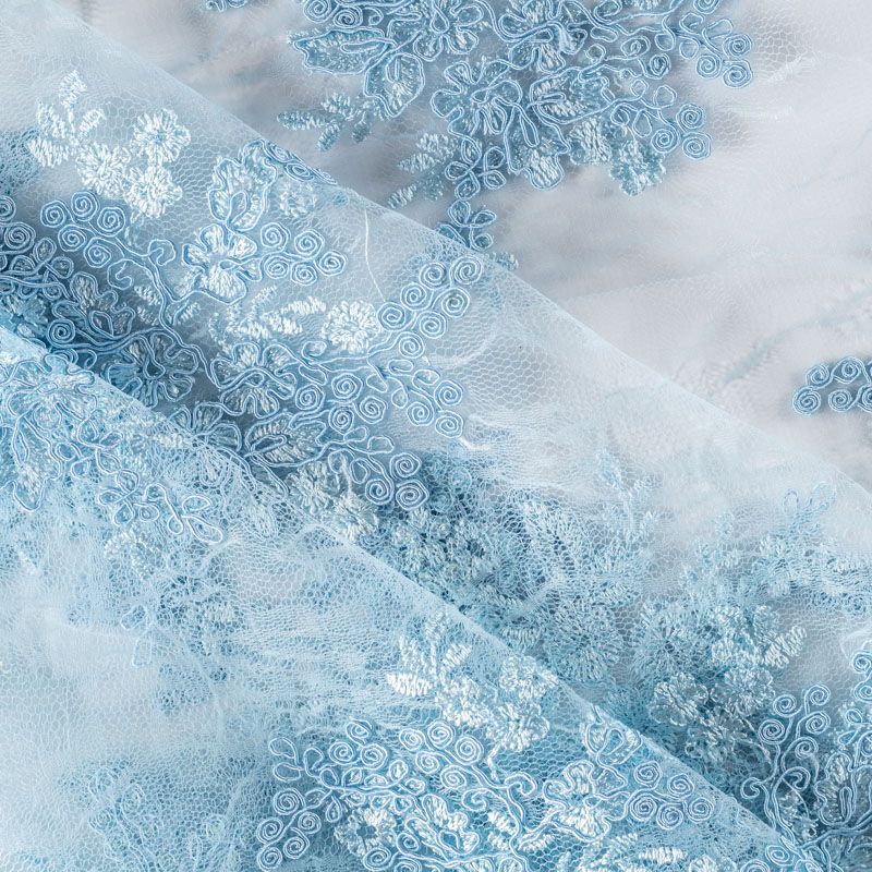 Кружевное полотно на сетчатой жаккардовой основе холодного светло-голубого оттенка с флористическим узором. Тонкое, легкое, очень мягкое и пластичное, хорошо драпируется, приятное тактильно. Вышивка оформлена кордовой нитью. С обеих сторон ткань украшена симметричными фестонами, что придает полотну законченный и нарядный вид. Великолепно будет смотреться в нарядном вечернем, свадебном платье, платье на выпускной бал, в юбках, блузках, топах. Также можно применять отдельные элементы для декора, которые вырезаются из полотна.