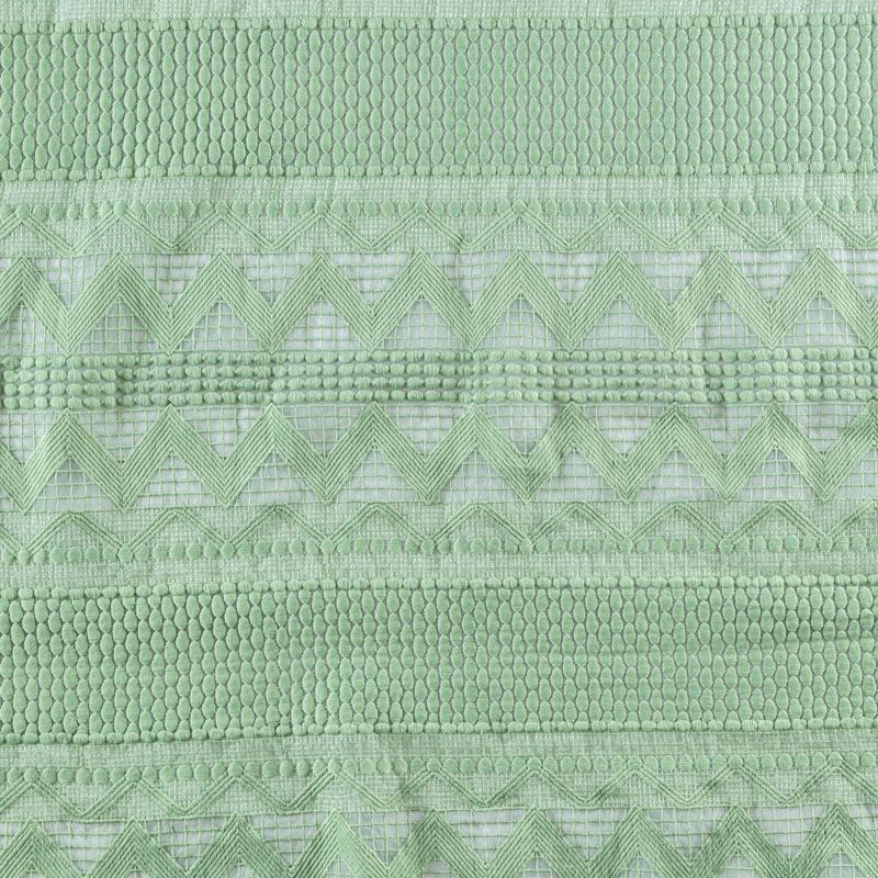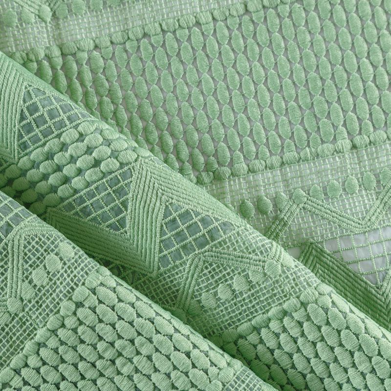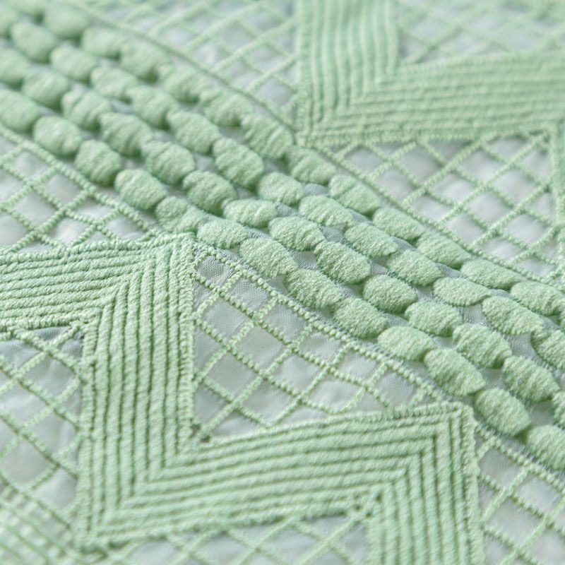 Итальянский гипюр-макраме зеленого оттенка на основе из органзы представляет собой полотно с рельефной текстурой с геометрическим ажурным плетением по всей ширине. Материал прозрачный на теле и на просвет, требуется подклад. За счет основы отлично держит форму. Всегда актуален при создании утончённых и роскошных нарядов, придавая им дороговизны и оригинальности. Может использоваться для пошива платьев, сарафана, костюма прямого кроя, топа, легкого кардигана, изготовления декоративных элеметов. На изделие набирается объемом.