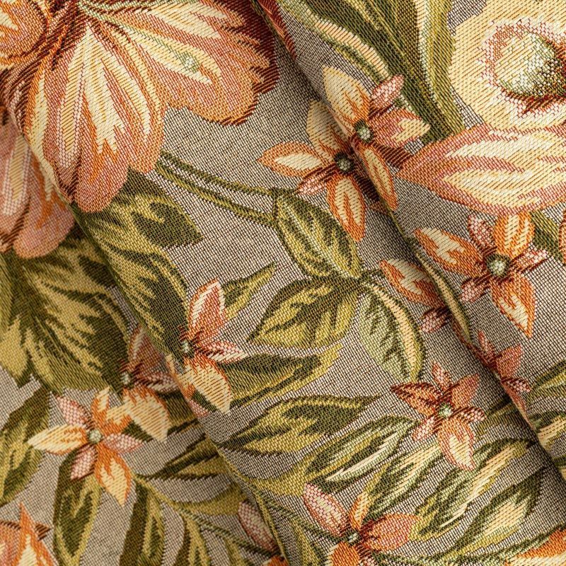 Гобелен представляет собой ткань, выполненную  перекрестным плетением нитей с одномоментным созданием сюжетной или орнаментальной композиции. Это плотный материал высокую прочность и износостойкость. Гобелен используют для пошива плотных светонепроницаемых штор, декоративного домашнего текстиля и аксессуаров, в мебельном производстве для обивки мебели. Так же применяется в рукоделии: модные кошельки, сумочки, пояса и другие аксессуары и при изготовлении дизайнерской одежды. На спокойном светло-сером фоне крупные цветы лилий в розово-персиковых оттенках.