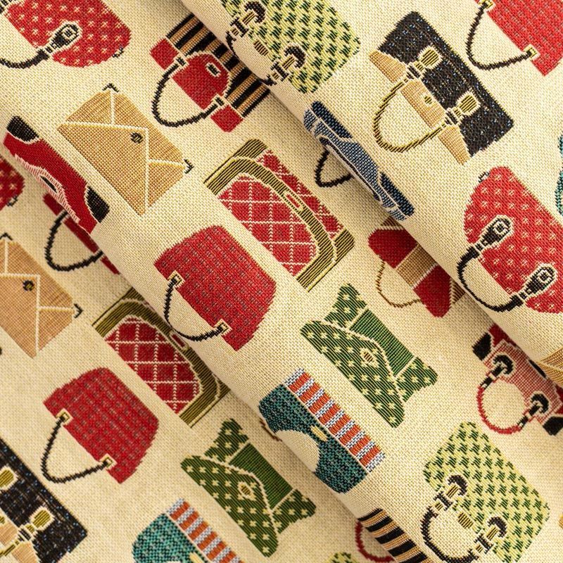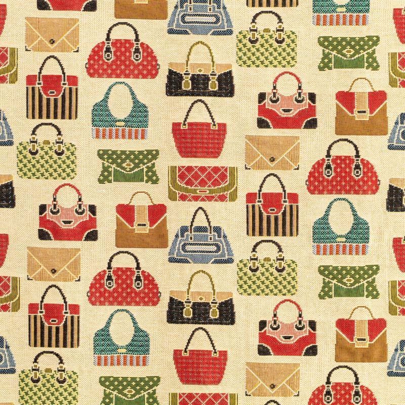 Гобелен представляет собой ткань, выполненную  перекрестным плетением нитей с одномоментным созданием сюжетной или орнаментальной композиции. Это плотный материал высокую прочность и износостойкость. Гобелен используют для пошива плотных светонепроницаемых штор, декоративного домашнего текстиля и аксессуаров, в мебельном производстве для обивки мебели. Так же применяется в рукоделии: модные кошельки, сумочки, пояса и другие аксессуары и при изготовлении дизайнерской одежды. На спокойном песочном фоне цветное разнообразие милых женских сумочек, клатчей, кошелечков.