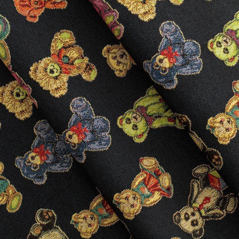 Гобелен представляет собой ткань, выполненную перекрестным плетением нитей с одномоментным созданием сюжетной или орнаментальной композиции. Это плотный материал высокую прочность и износостойкость. Гобелен используют для пошива плотных светонепроницаемых штор, декоративного домашнего текстиля и аксессуаров, в мебельном производстве для обивки мебели. Так же применяется в рукоделии: модные кошельки, сумочки, пояса и другие аксессуары и при изготовлении дизайнерской одежды. На черном фоне всеми любимые разноцветные игрушки - мишки-тедди.