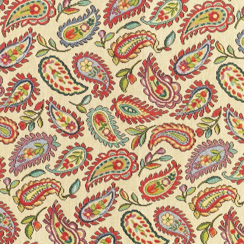 Гобелен представляет собой ткань, выполненную перекрестным плетением нитей с одномоментным созданием сюжетной или орнаментальной композиции. Это плотный материал высокую прочность и износостойкость. Гобелен используют для пошива плотных светонепроницаемых штор, декоративного домашнего текстиля и аксессуаров, в мебельном производстве для обивки мебели. Так же применяется в рукоделии: модные кошельки, сумочки, пояса и другие аксессуары и при изготовлении дизайнерской одежды. На спокойном песочно-бежевом фоне растительный цветной узор в стиле пейсли.