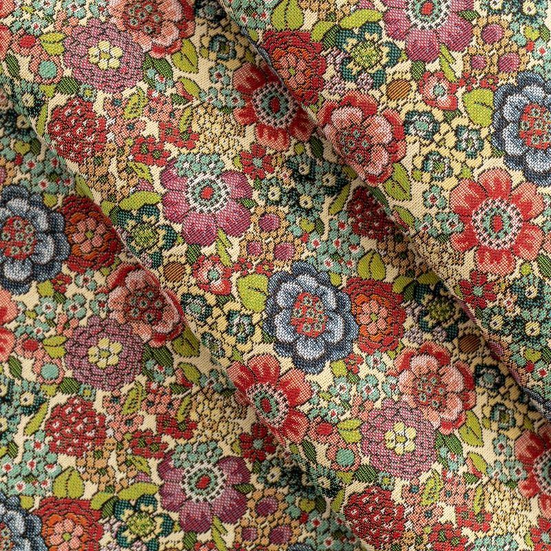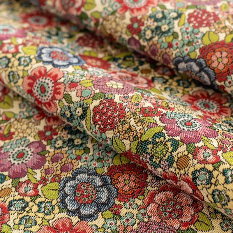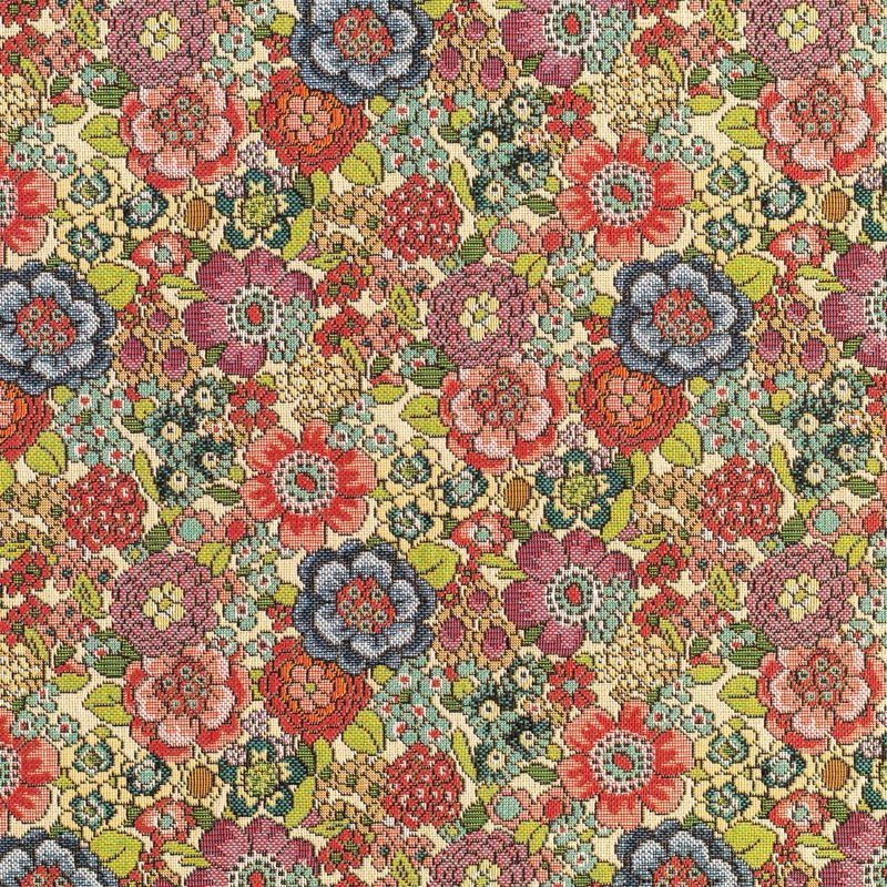 Гобелен представляет собой ткань, выполненную  перекрестным плетением нитей с одномоментным созданием сюжетной или орнаментальной композиции. Это плотный материал высокую прочность и износостойкость. Гобелен используют для пошива плотных светонепроницаемых штор, декоративного домашнего текстиля и аксессуаров, в мебельном производстве для обивки мебели. Так же применяется в рукоделии: модные кошельки, сумочки, пояса и другие аксессуары и при изготовлении дизайнерской одежды. На бежевом фоне стилизованные цветы, выполненные в богатой цветовой палитре.