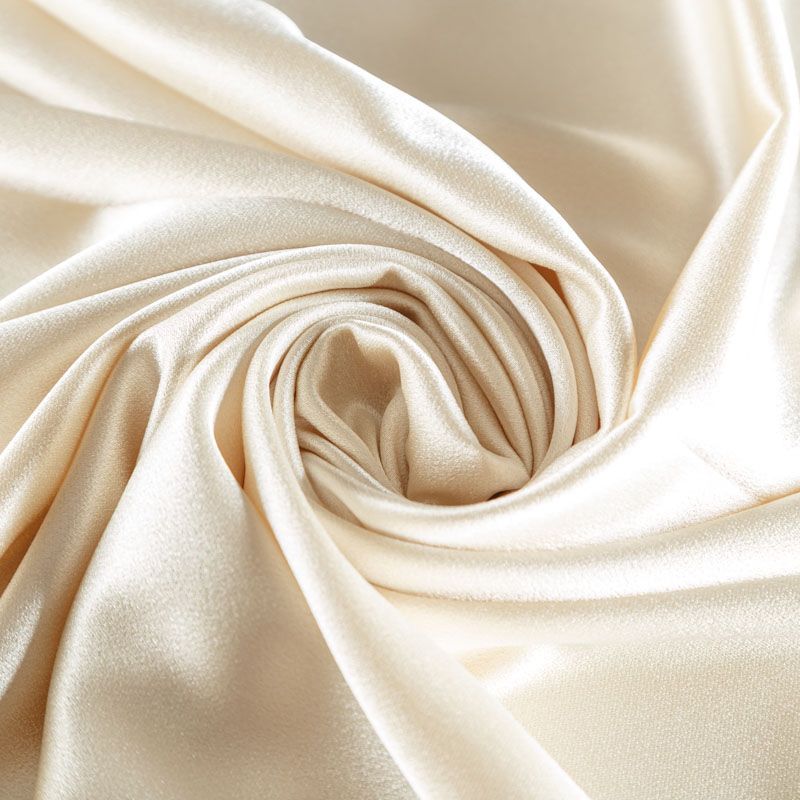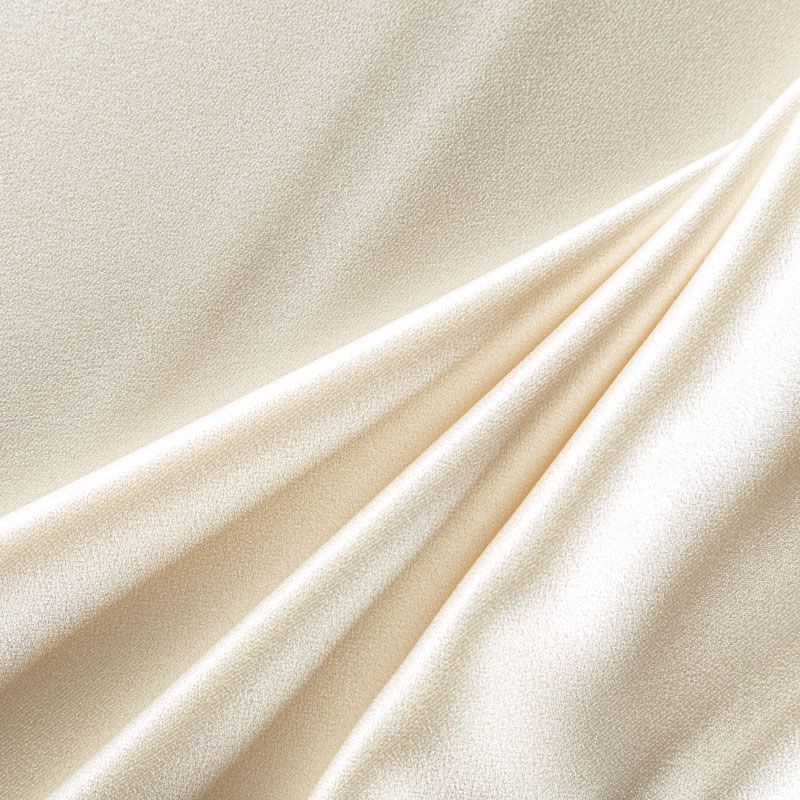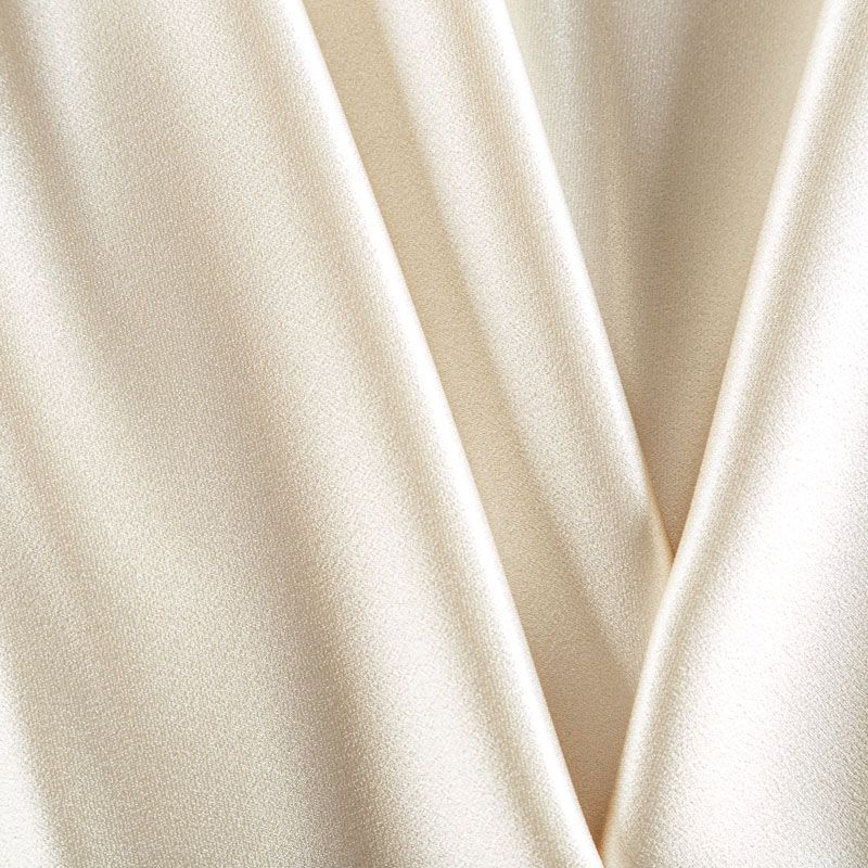 Итальянская ткань кади жемчужно-золотистого оттенка. Кади — это креп-атлас с красивым глянцевым блеском. Ткань с плотной фактурой, роскошно ниспадает, очень хорошо тянется, изумительно садится по фигуре и шикарно смотрится в изделии. Она хорошо драпируется, эффектно облегает. Подходит для пошива удлиненных платьев с драпировками, платья-футляра, брюк палаццо, юбки-карандаш, жакета, туники, кроп-топа, а также для вечерних, свадебных и  выпускных платьев и костюмов.