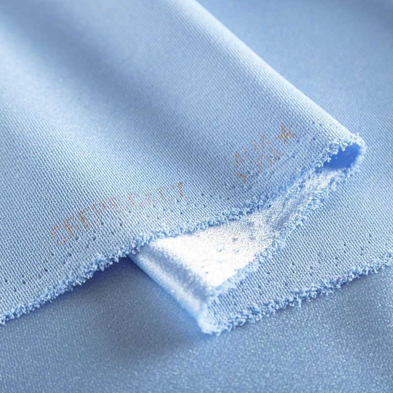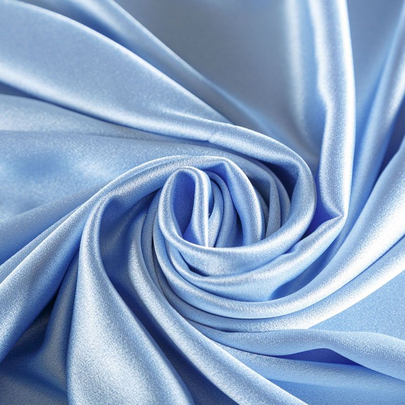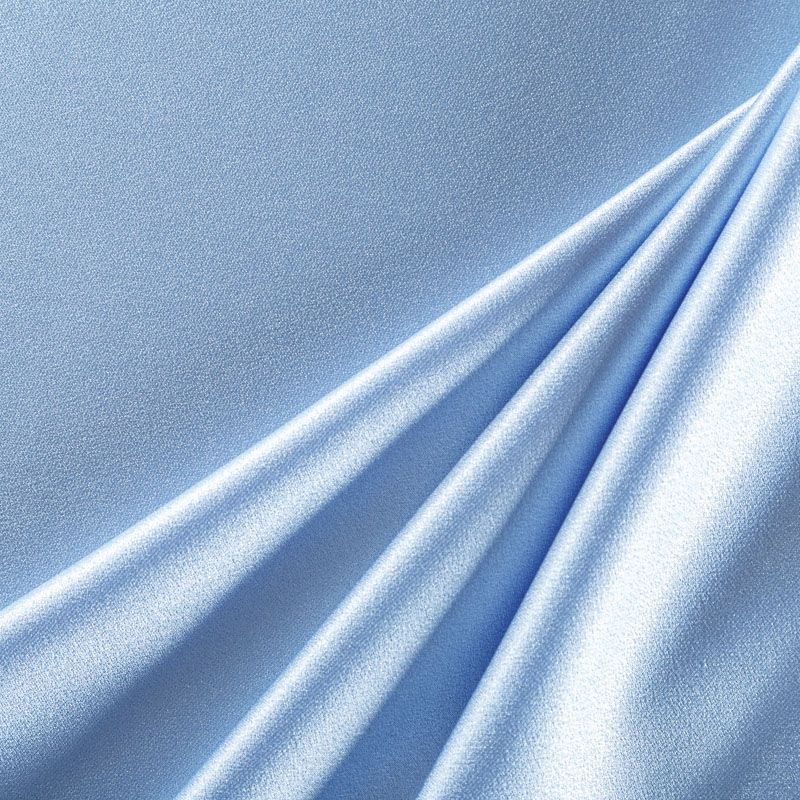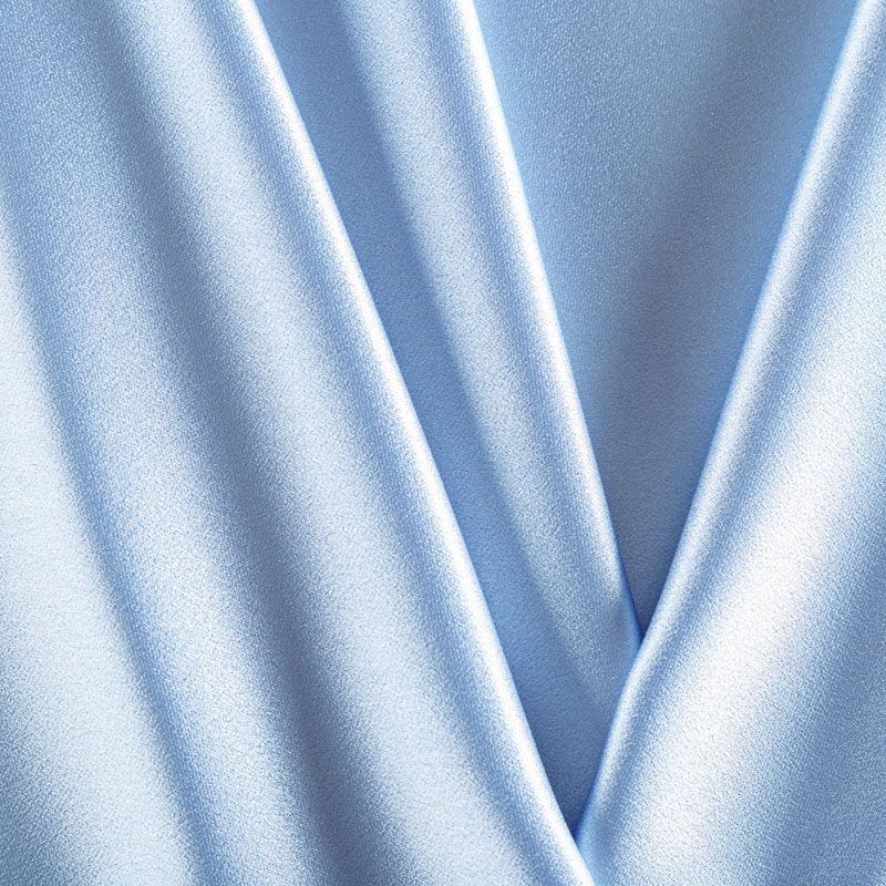 Итальянская ткань кади холодного голубого оттенка. Кади — это креп-атлас с красивым глянцевым блеском. Ткань с плотной фактурой, роскошно ниспадает, очень хорошо тянется, изумительно садится по фигуре и шикарно смотрится в изделии. Она хорошо драпируется, эффектно облегает. Подходит для пошива удлиненных платьев с драпировками, платья-футляра, брюк палаццо, юбки-карандаш, жакета, туники, кроп-топа, а также для вечерних, свадебных и  выпускных платьев и костюмов.
