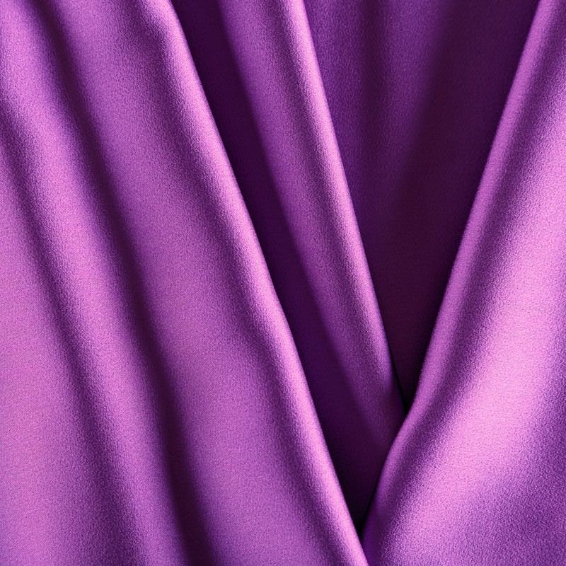 Итальянская ткань кади лилового оттенка. Кади — это креп-атлас с красивым глянцевым блеском. Ткань с плотной фактурой, роскошно ниспадает, очень хорошо тянется, изумительно садится по фигуре и шикарно смотрится в изделии. Она хорошо драпируется, эффектно облегает. Подходит для пошива удлиненных платьев с драпировками, платья-футляра, брюк палаццо, юбки-карандаш, жакета, туники, кроп-топа, а также для вечерних, свадебных и  выпускных платьев и костюмов.