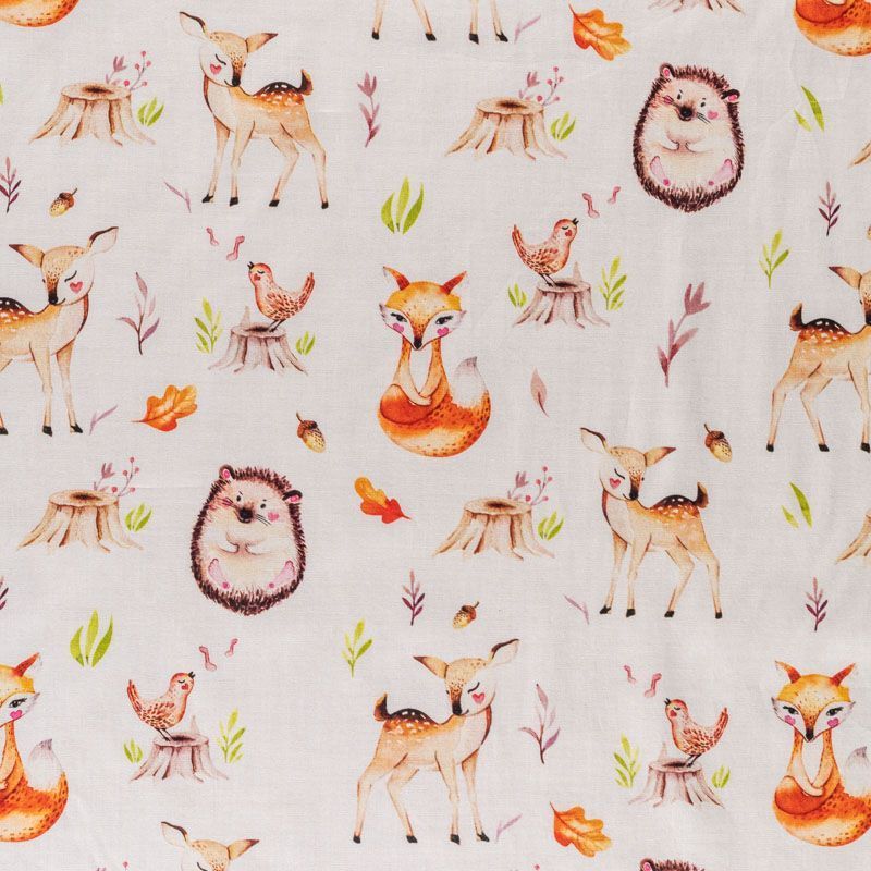 Итальянский натуральный хлопок с детским рисунком в виде лесных милых зверушек. Ткань легкая, тонкая, хорошо "дышит", мягкая, слегка прозрачная, по плотности напоминает батист. Подойдет для пошива домашней одежды, детских летних платьев, песочников, юбки, сарафана или рубашки, а также для для пошива постельных принадлежностей, подушек, покрывал, скрапбукинга, корзин и других видов творчества.