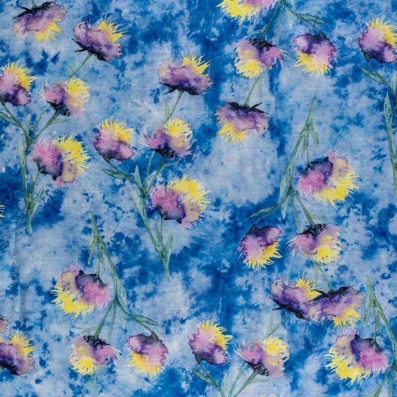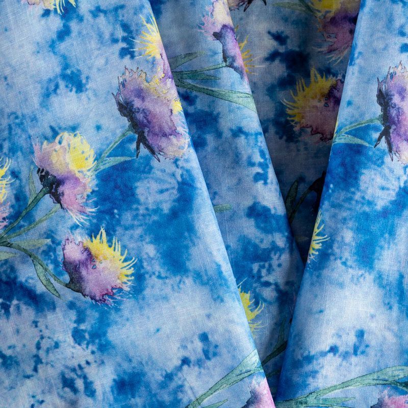 Плательно-блузочная ткань из натурального хлопка с яркими бутонами васильков на сине-голубом фоне. Ткань легкая, тонкая, хорошо "дышит", мягкая, слегка прозрачная, по плотности напоминает батист. Подойдет для пошива летнего платья, летящей юбки, блузы, сарафана или рубашки.