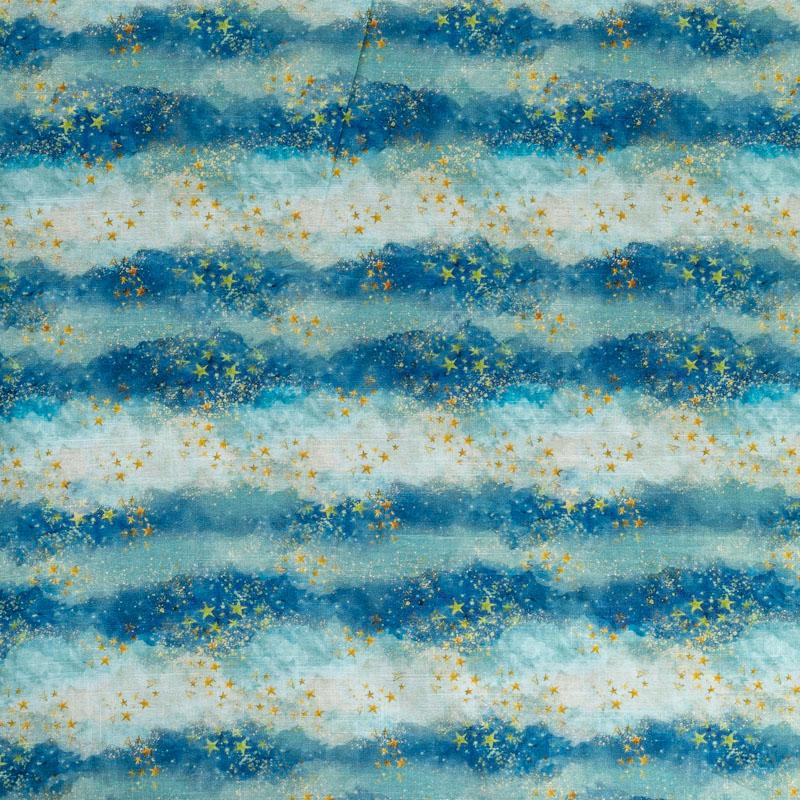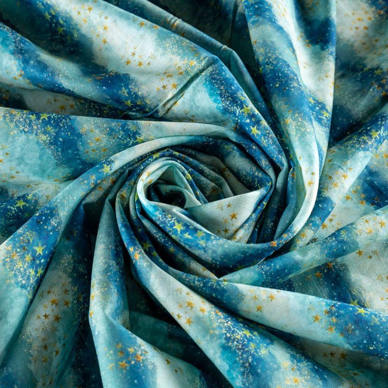 Плательно-блузочная ткань из натурального хлопка с рисунком в виде горизонтальных волн с россыпью мелких звездочек. Ткань легкая, тонкая, хорошо "дышит", мягкая, слегка прозрачная, по плотности напоминает батист. Подойдет для пошива летнего платья, летящей юбки, блузы, сарафана или рубашки.